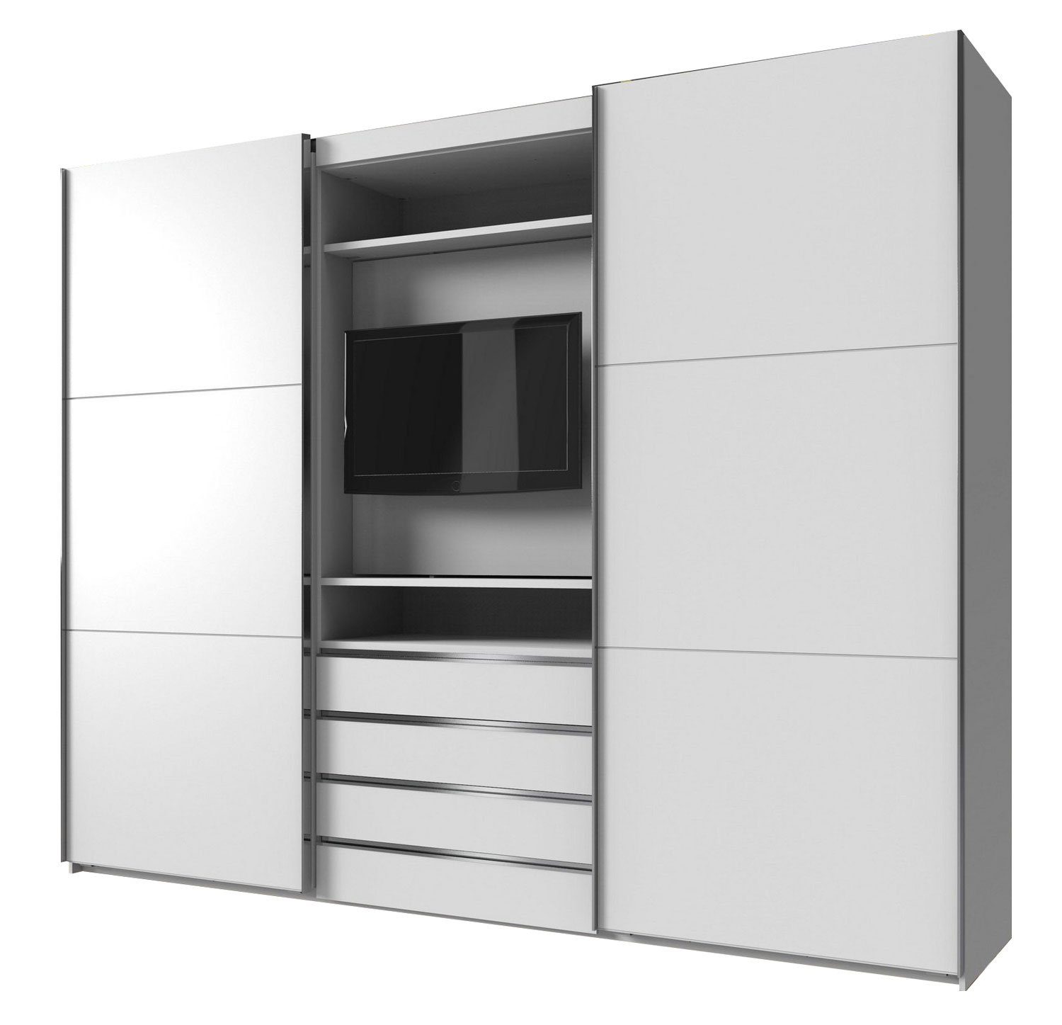 - links und rechts je 1 Schwebetür, dahinter jeweils Einlegeböden und 1 Kleiderstange