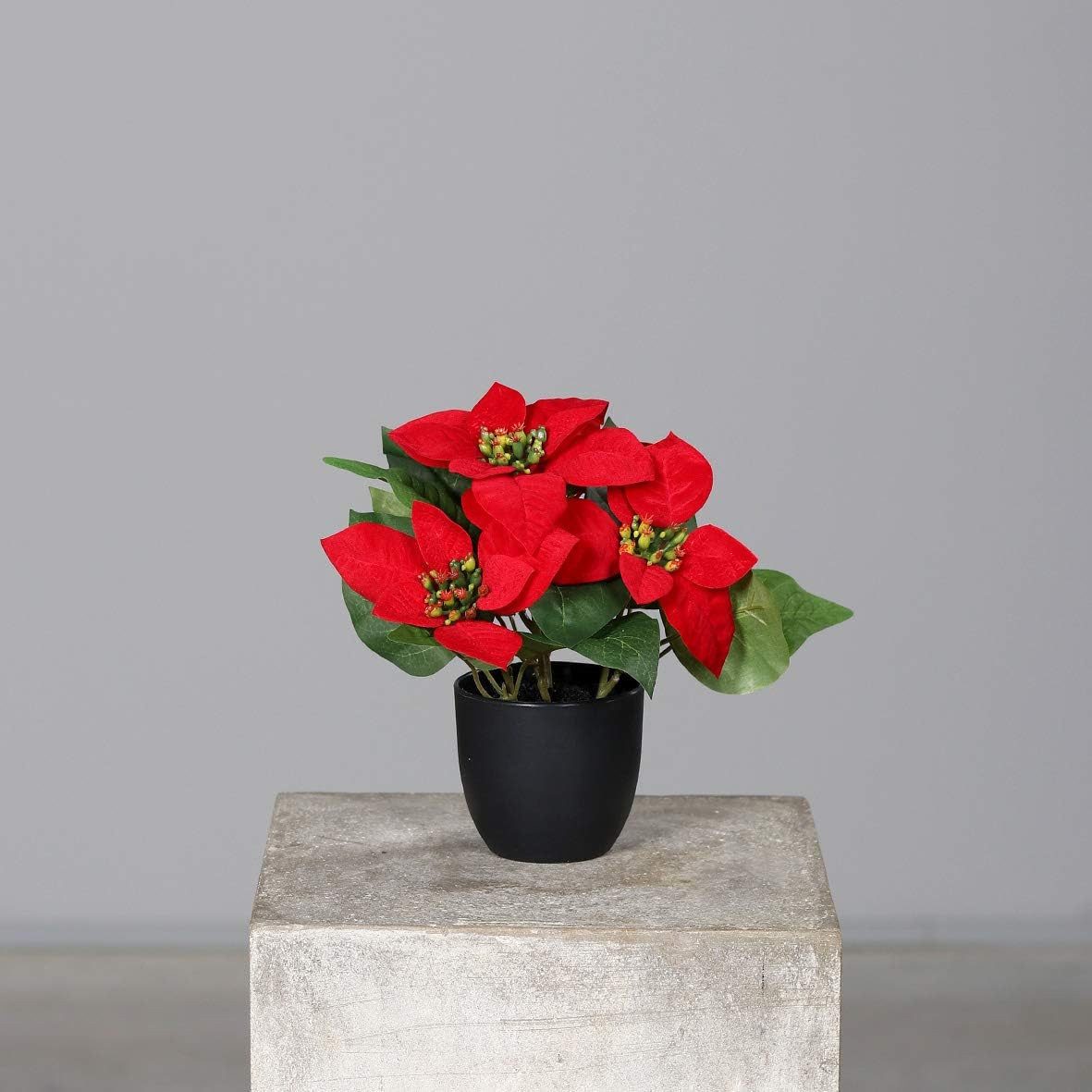 Dieser wunderschöne künstliche rote Weihnachtstern der Marke mucplants ist die ideale Dekopflanze im Herbst und Winter für Ihr Zuhause. Der künstliche Weihnachtsstern ist in einem schwarzen Kunststofftopf gepflanzt. Der Weihnachtsstern besteht aus sechs roten Blüten, die aus hochwertigem samtweichen Textilfasermaterial gefertigt sind. Die künstliche Pflanze benötigt keine spezielle Pflege, wie zum Beispiel Licht, Wärme oder Wasser und ist daher bestens als Treppen- und Zimmerdekoration für Ihr Zuhause, Büro oder Gaststätte geeignet. Unsere Kunstpflanze überzeugt durch ihre hohe Qualität und der naturgetreuen Optik. Überzeugen Sie sich selbst von der Qualität und lassen Sie sich von der Echtheit beeindrucken. Warnhinweise Achtung: Dieses künstliche Produkt enthält Materialien, die bei empfindlichen Personen Hautreizungen oder allergische Reaktionen auslösen können. Bitte mit Vorsicht handhaben und von Kindern und Haustieren fernhalten.