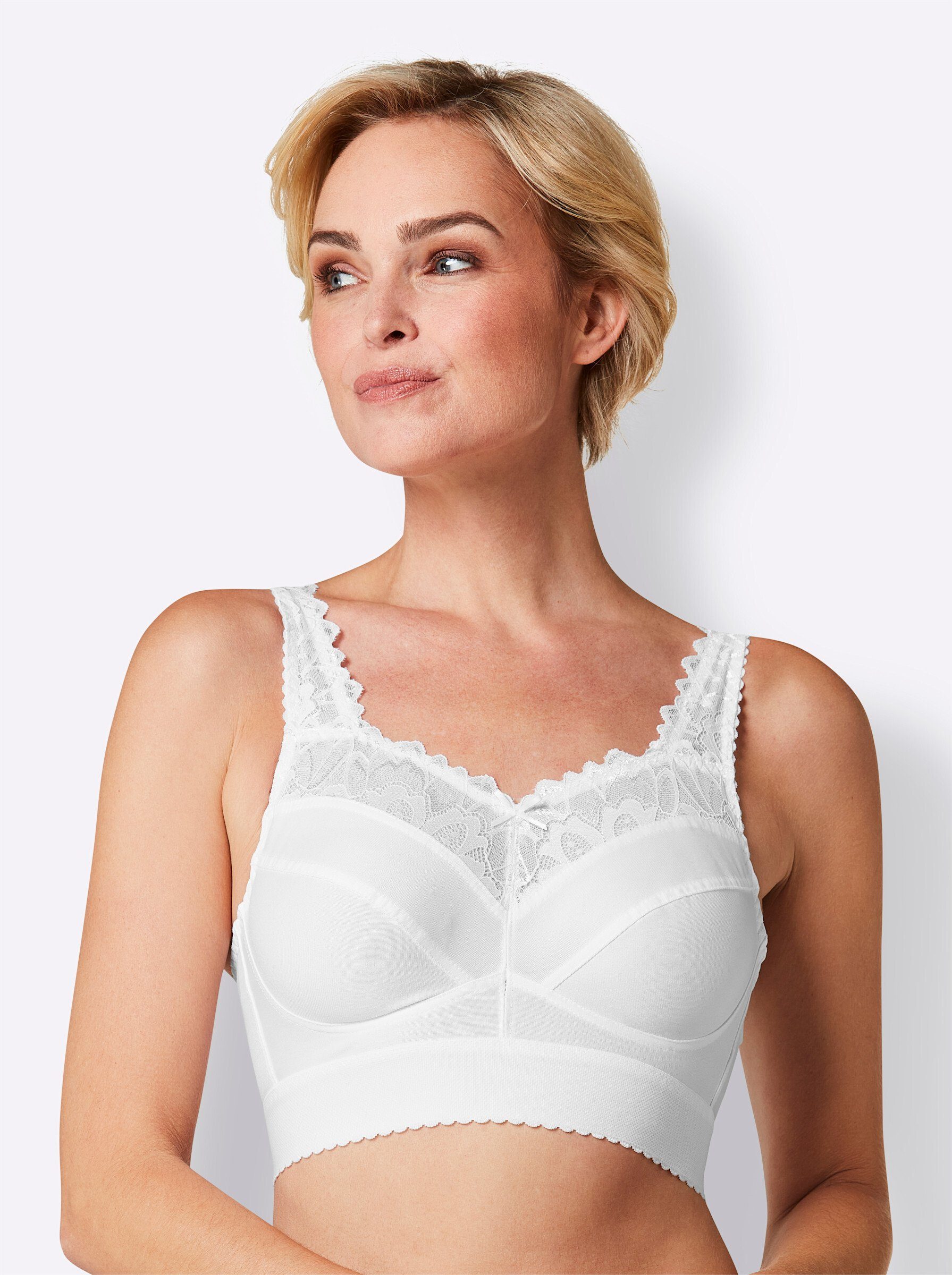 Von wäschepur: BH lang ohne Bügel mit wunderschöner Spitzenverzierung am Dekolleté. 2-geteilte Cups. Träger im Rücken verstellbar. Weiches, breites Unterbrustband für einen perfekten Sitz.
