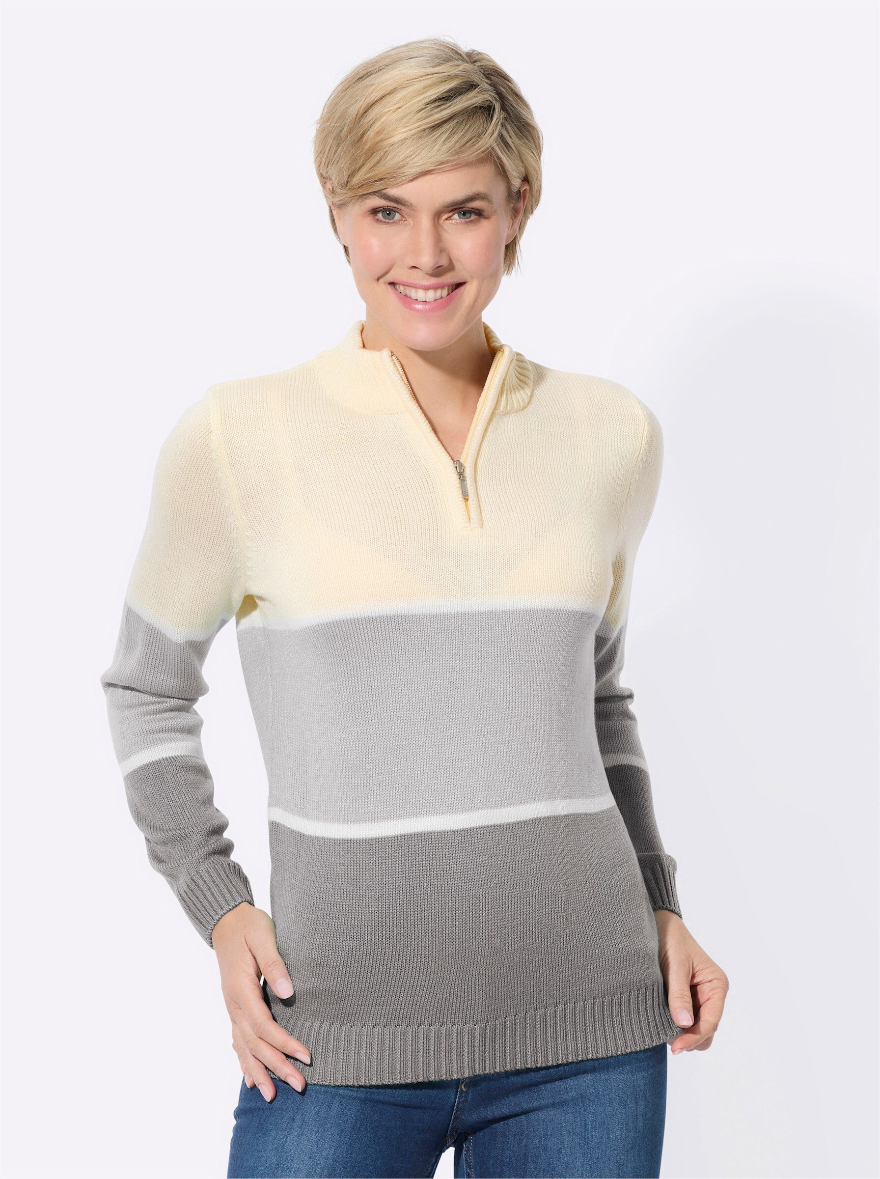 Angenehm weicher und wohlig wärmender Pullover in farbharmonischer Colour-Blocking-Optik. Schützender Stehkragen mit Reißverschluss. Elastisch gerippte Bündchen an den langen Ärmeln und gerippter Saum.