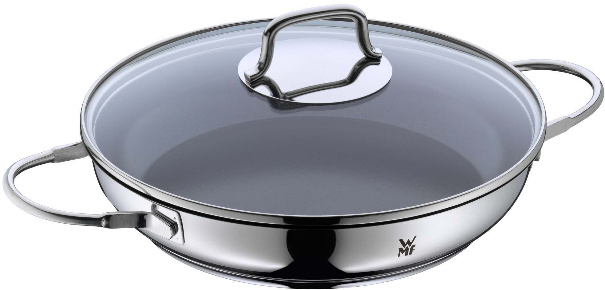 Ob knackiges Gemüse, edler Fisch oder leckere Fleischgerichte: Die vielseitige Servierpfanne mit Glasdeckel und 26 cm Durchmesser von WMF ist wie gemacht für die abwechslungsreiche Küche. Das Multitalent lässt sich sowohl auf dem Herd als auch im Backofen verwenden. Ihre robuste keramische Antihaftversiegelung ist extrem hitbeständig, während der energiesparende TransTherm®-Allherdboden für eine optimale Wärmeverteilung und -speicherung sorgt – für köstliche Bratergebnisse jeden Tag. Gefertigt aus robustem, elegantem Cromargan®: Edelstahl Rostfrei 18/10 ist diese Servierpfanne für alle Herdarten einschließlich Induktion geeignet und somit unverzichtbar in jeder Küche. Praktischer Extra: Der hochwertige Glasdeckel mit Edelstahlgriff macht die Garkontrolle kinderleicht.