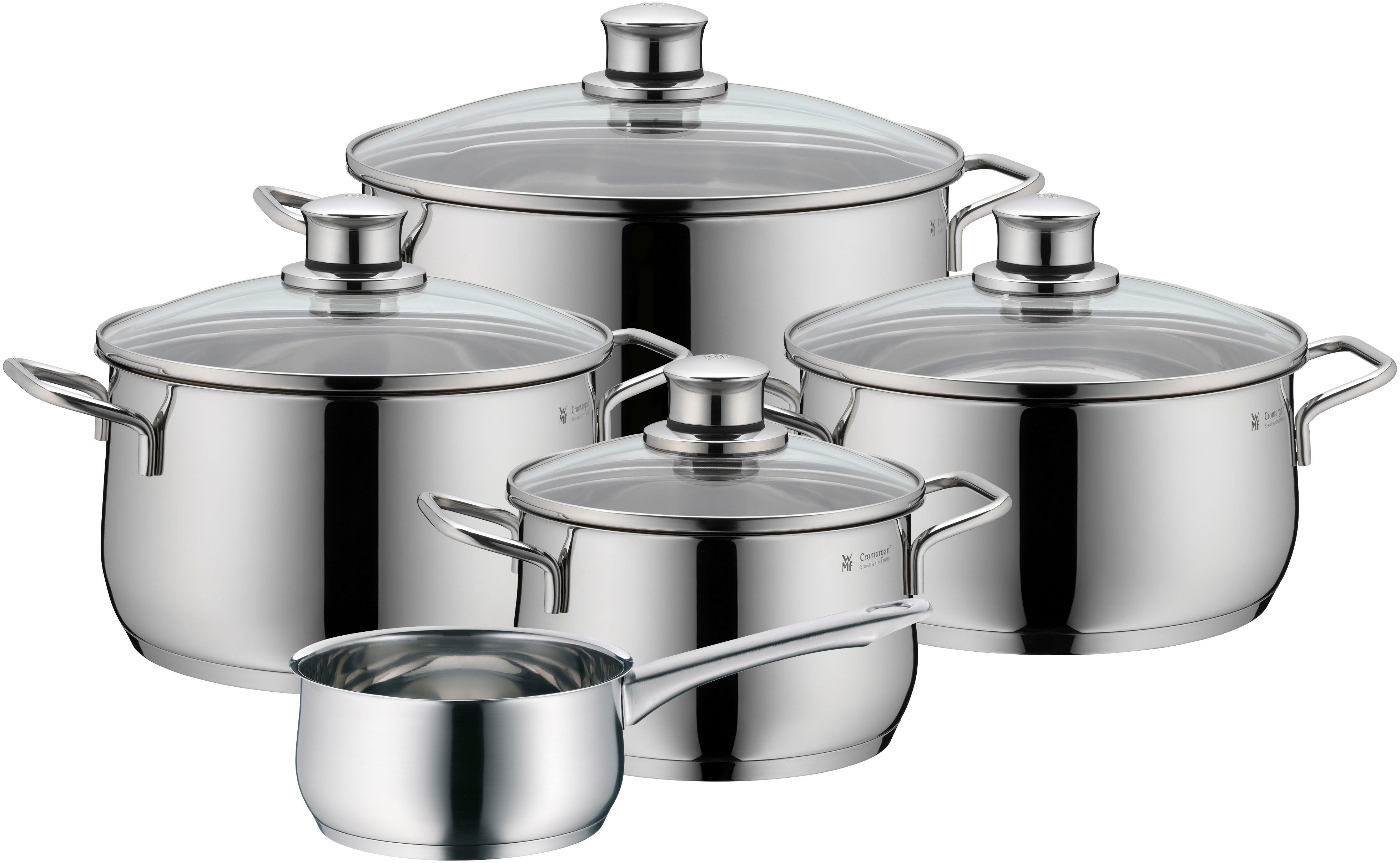 Lieferumfang | WMF Diadem Plus 5-teiliges Kochgeschirr-Set bestehend aus 1x Bratentopf mit Deckel (20 cm), 3x Fleischtopf mit Deckel (16/20/24 cm), 1x Stielkasserolle (16 cm) |