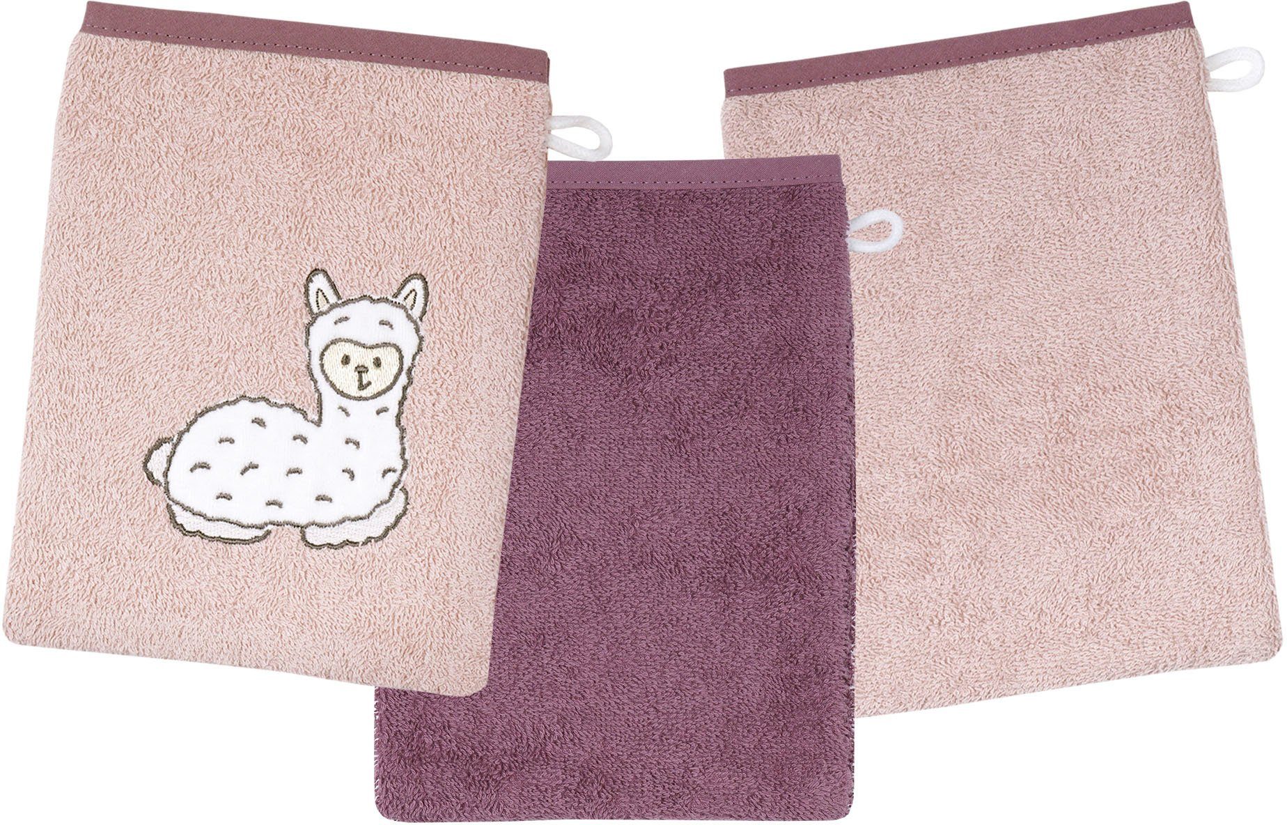 Wörner Waschhandschuh Lama rosa Waschhandschuh 3er Set, (3-St), 1x mit süßer Lamastickerei, 2x unifarben