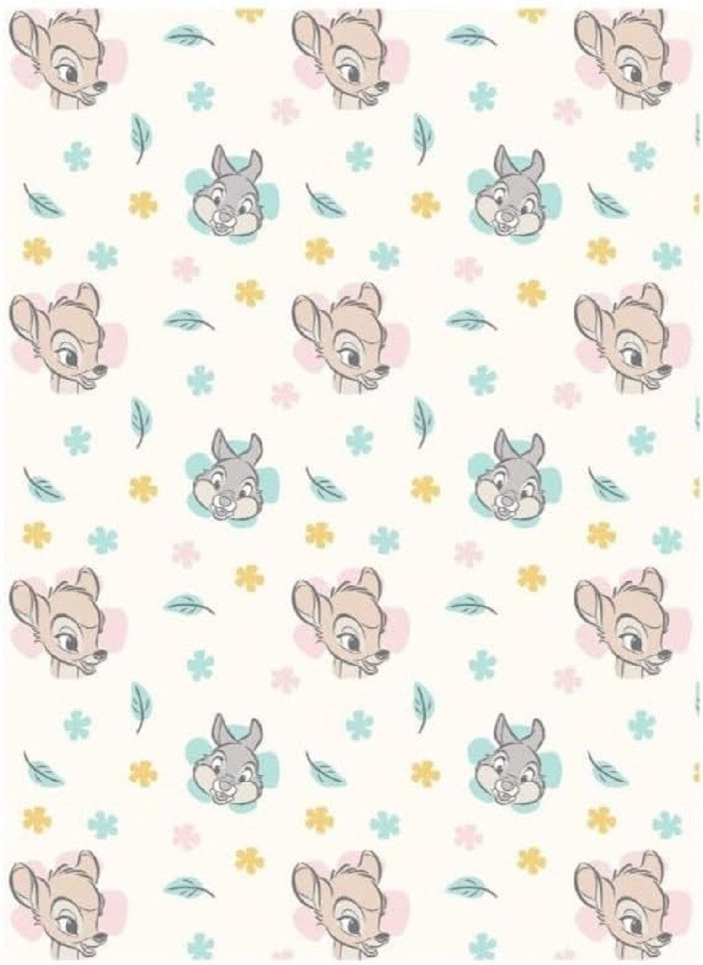 Das Design der Decke zeigt ein zauberhaftes Bambi-Motiv aus dem Disney-Universum. Auf einem hellen Hintergrund wiederholen sich die liebenswerten Köpfe von Bambi und seinem besten Freund Klopfer, dem Hasen, umgeben von zarten hellblauen Blättern sowie kleinen pinken und gelben Blüten. Dieses bezaubernde Muster macht die Decke zu einem echten Hingucker und begeistert Jungen und Mädchen gleichermaßen.