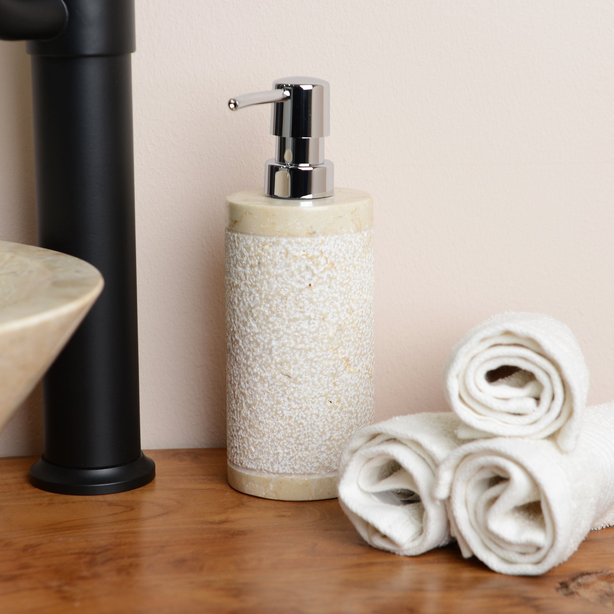 Der Seifenspender ist aus einem Marmorblock gefräst worden und von Hand geschlagen und mit der Flex-Maschine nachbearbeitet und poliert.