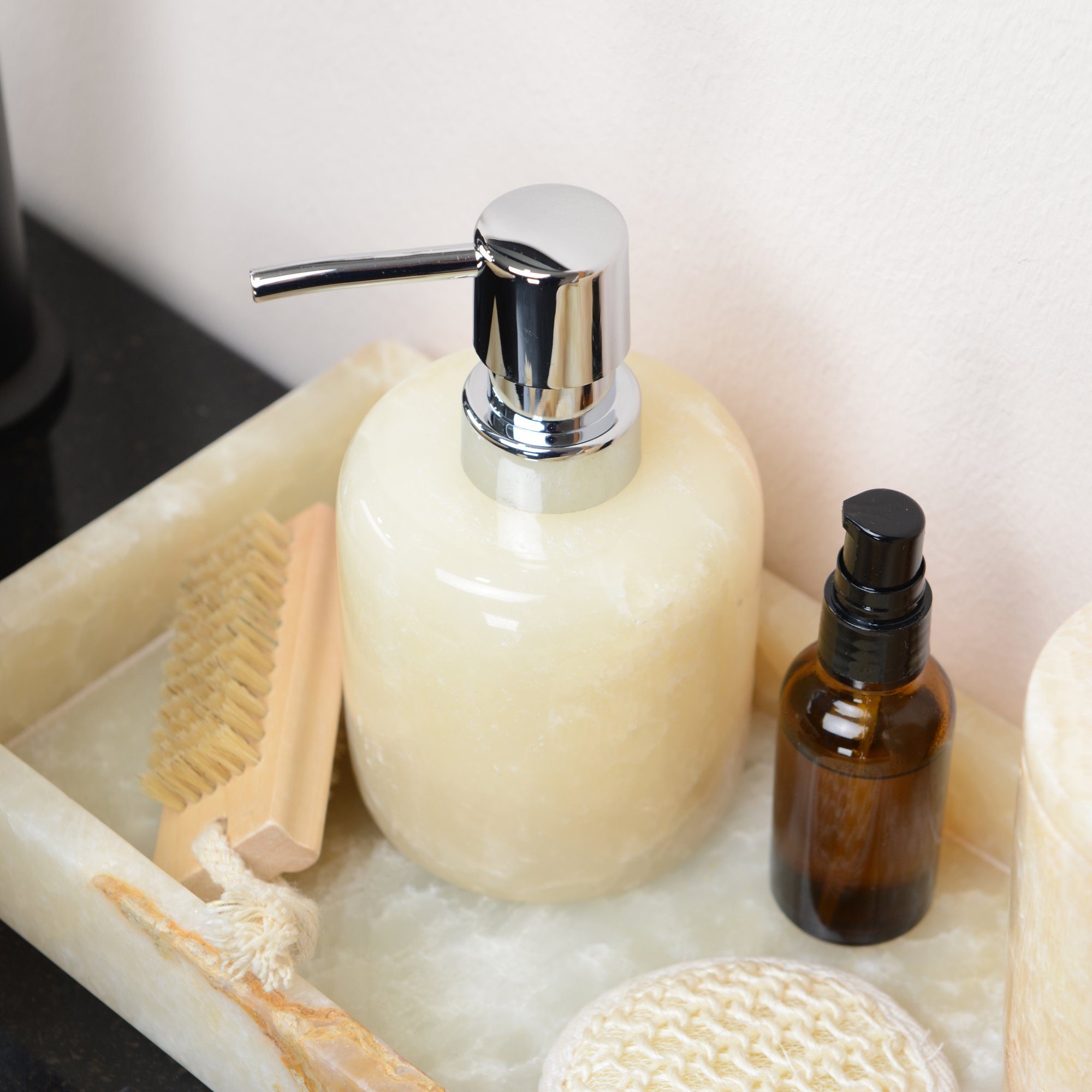 Der Seifenspender besteht aus hochwertigem Onyxmarmor. Ein Kalkstein, der sich über Kalkteilchen aus Quellwasser oder durch Sickerwasser in natürlichen Hohlräumen gebildet hat.