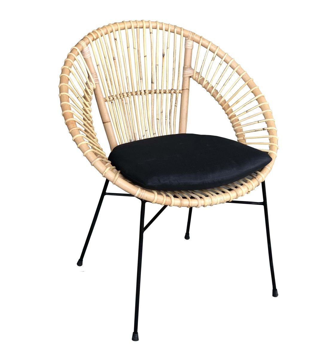 Der Stuhl ZORA aus einem Eisengestell umflochten mit Rattan in der Farbe „natur“ inkl. schwarzem Kissen im Boho Chic ist der perfekte Begleiter für jeden Raum. Hergestellt aus hochwertigem Eisen und Rattan in natürlicher Optik, ergänzt dieser Stuhl jeden Wohnstil und verleiht Ihrem Zuhause ein wohnliches, zeitloses Flair. Der Rattanstuhl ist nicht nur ein echter Blickfang, sondern auch super gemütlich. Das schwarze Kissen sorgt für zusätzlichen Komfort und lädt zum Verweilen ein. Und wenn mal etwas daneben geht, keine Sorge - der Stuhl lässt sich ganz einfach mit Wasser und neutraler Seife reinigen. Der Stuhl wird fertig aufgebaut geliefert und ist stapelbar