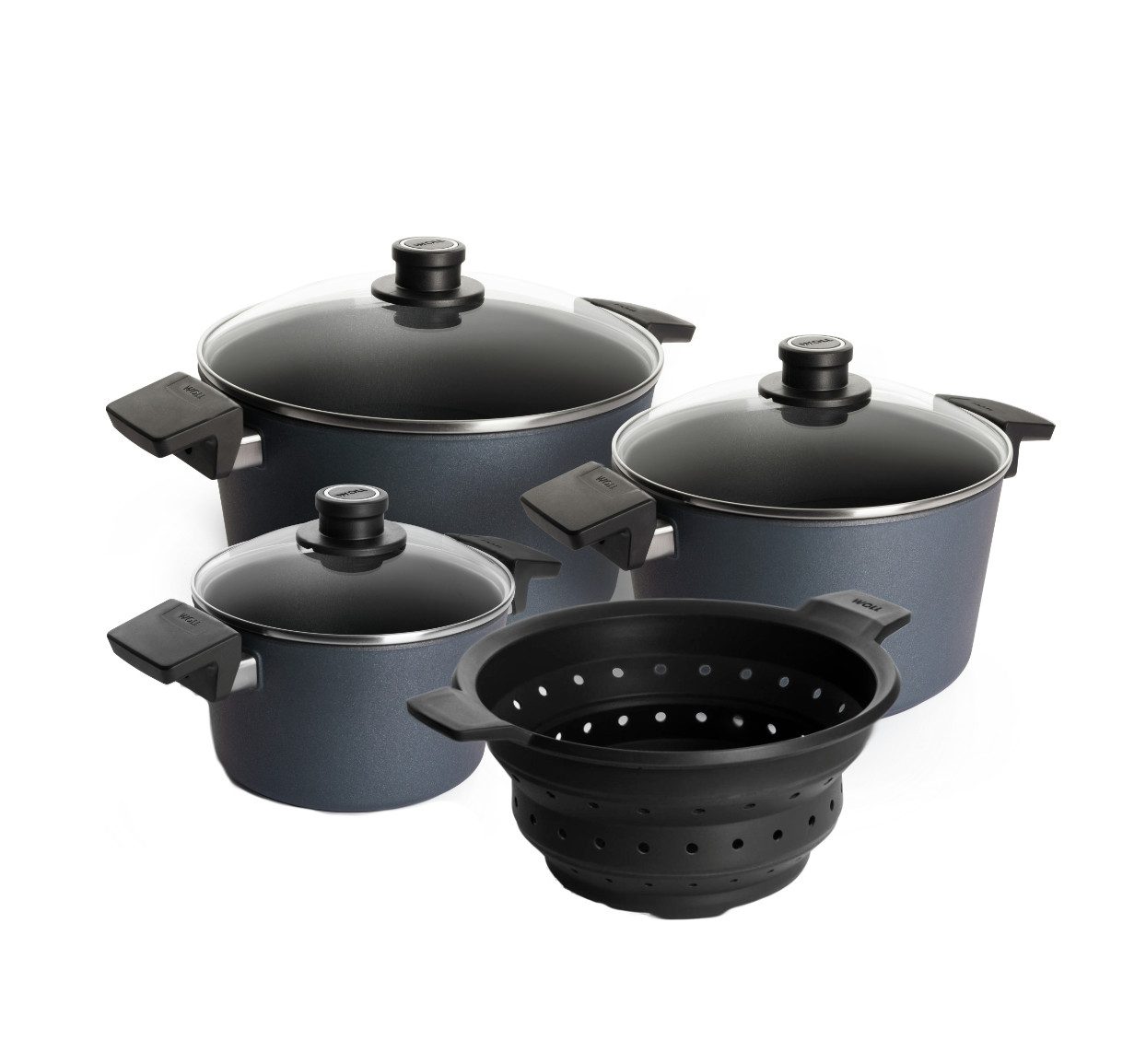 Das Topfset Diamond Lite ist die perfekte Ergänzung für Ihre Küche. Es besteht aus hochwertigen Gusstöpfen in den Größen Ø 20 cm, 24 cm, 28 cm, sowie einem praktischen Siebeinsatz mit Ø 28 cm. Jeder Topf ist zwischen 11,5 cm und 15,5 cm hoch. Das Set wird in einer eleganten Box geliefert und eignet sich daher auch hervorragend als Geschenk. Die Diamond Lite Serie ist bei unseren Kunden äußerst beliebt, und das aus gutem Grund. Jedes der handgegossenen Aluminiumprodukte ist mit einer ultraharten Diamantversiegelung ausgestattet. Dadurch wird nicht nur fast fettfreies Kochen ermöglicht, sondern auch ein kinderleichter Abwasch. Sie werden die Leichtigkeit und Effizienz beim Zubereiten Ihrer Lieblingsgerichte lieben. Mit dem Topfset Diamond Lite holen Sie sich nicht nur erstklassige Qualität, sondern auch eine erstklassige Kocherfahrung in Ihre Küche. Entdecken Sie die Vorteile der Diamantversiegelung und genießen Sie gesunde und schmackhafte Mahlzeiten.
