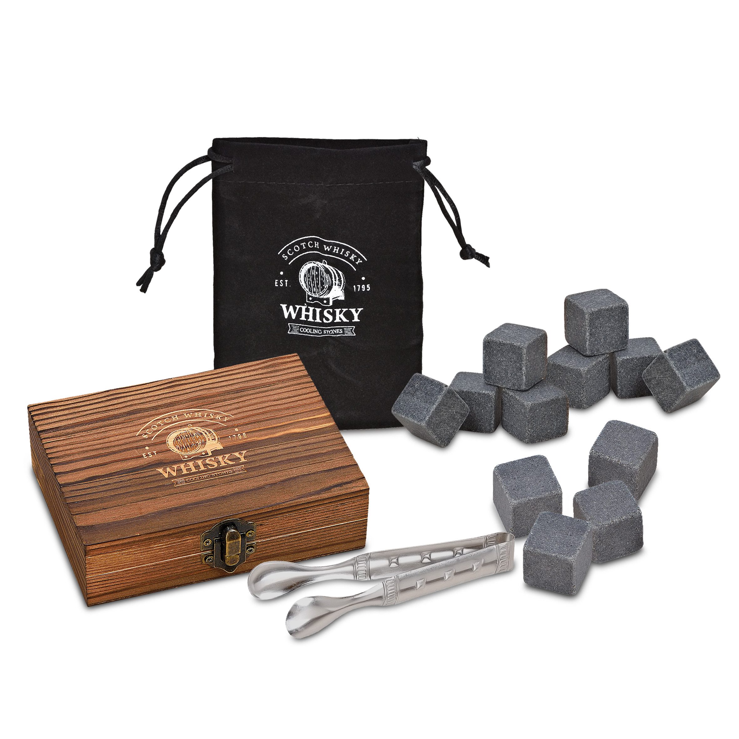 14-teiliges Geschenk Set in edler Holzbox mit 12x Whisky Kühlstein aus Basalt, 1x Zange und Samt-Aufbewahrungsbeutel