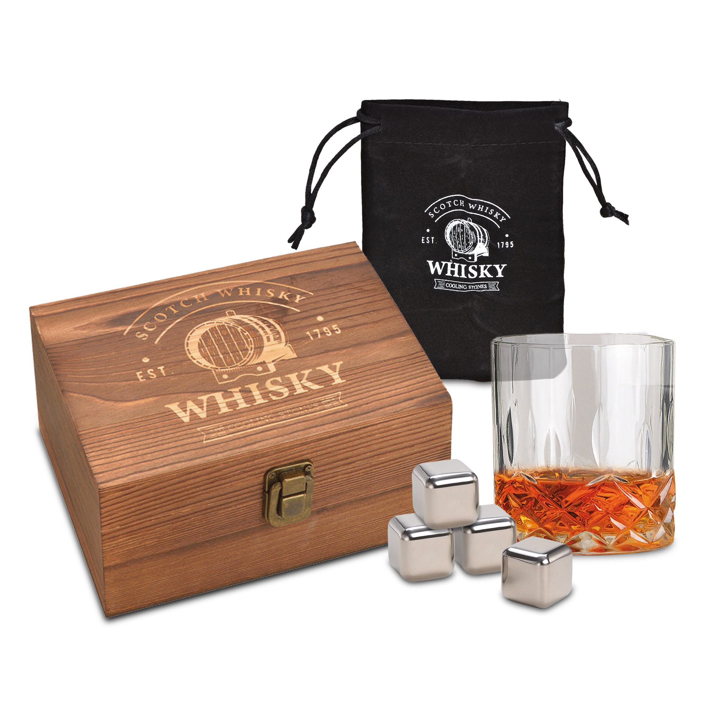 6-teiliges Geschenk Set in edler Holzbox mit 4x Whisky Kühlstein aus Edelstahl, 1x Whiskyglas und 1x Samtbeutel