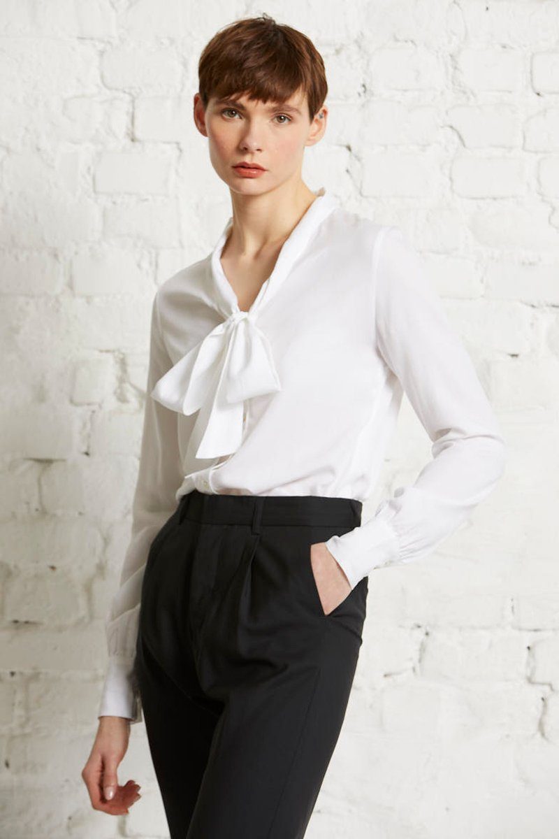 Die langärmlige Tie neck blouse aus 100% TENCEL™ mit im Kragen integrierter Schleife, ist von der Pariser Mode inspiriert. Diese außergewöhnliche aber gleichzeitig stilvolle Bluse ist für besondere Anlässe, entspannte Ausgehabende, sowie für einen Alltagslook perfekt geeignet. Die Ärmelabschlüsse mit Manschetten verleihen der Tie neck blouse nochmals einen formellen Charakter.