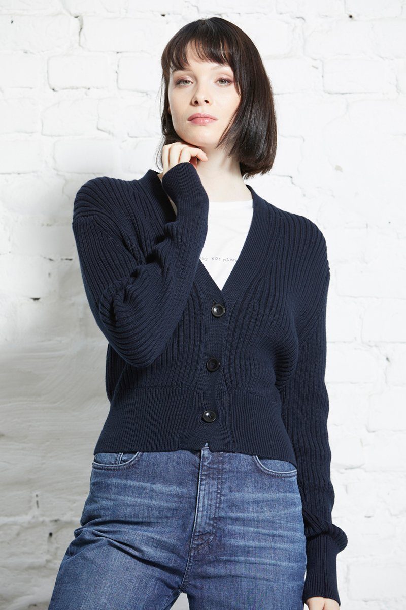 Die perfekte kleine Strickjacke wenn es mal etwas kühler wird. Durch die hübsche kürzere Form sieht sie auch über Kleidern oder Röcken super aus, ohne zu schwer oder unförmig zu wirken. Aus 100% GOTS zertifizierter Biobaumwolle gefertigt, hat sie einen guten stabilen Griff und trägt sich extrem angenehm. Geschlossen wird sie mit schönen Knöpfen aus Steinnuss, einem besonders widerstandsfähigem Naturprodukt.