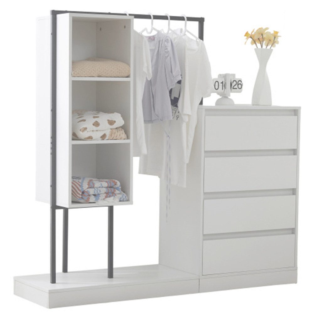 Reichlich Stauraum: Vier Schubladen und drei offene Ablageflächen bieten Platz für Kleidung, Bücher, Taschen und mehr. Zudem können auch Kleidungsstücke zum Hängen aufbewahrt werden.