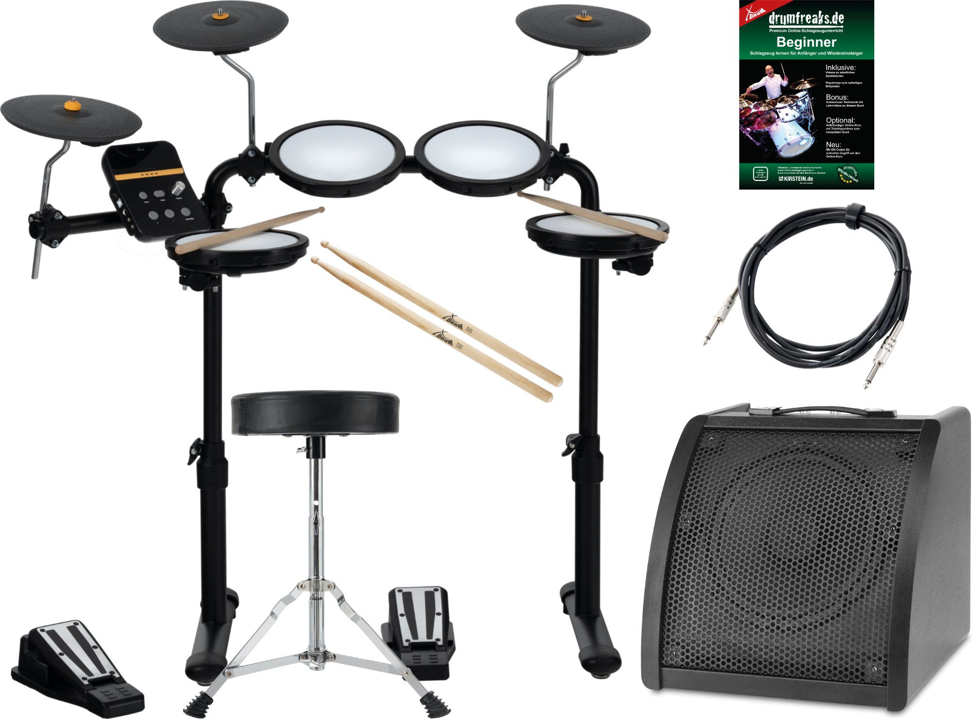 Ausstattung | 12 Preset Kits Snare- und Tompads mit Mesh Heads 10 Songs zum Mitspielen Lässt sich schnell und platzsparend zusammenklappen |
