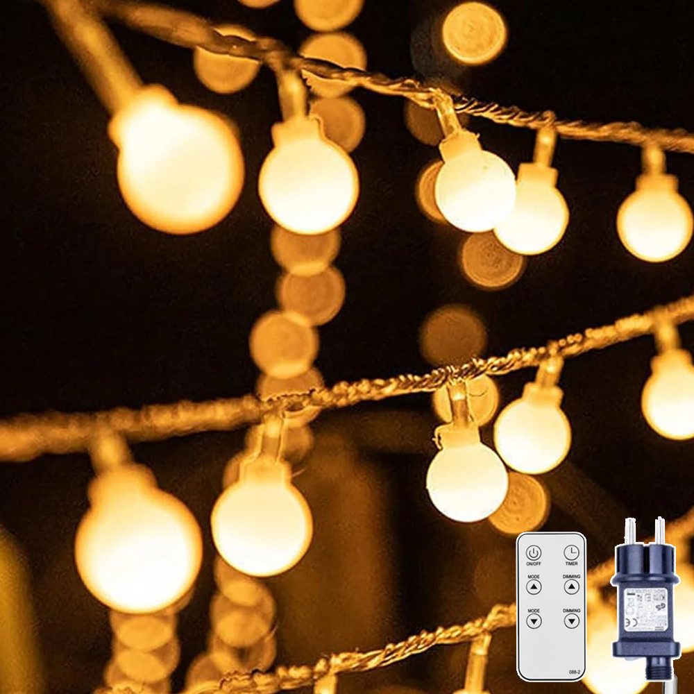Warmweiße und Bunt Kugel Lichterkette : 20 Meter Lichterkette + 3 Meter Stromkabel, LED Menge: 150 warmweißen und Bunt LEDs. LED Abstand: 13cm, Durchmesser der Kugel:Φ18mm, strombetrieben.// Hinweis: Vor dem Einsetzen der Fernbedienung entfernen Sie bitte den Kontaktschutz Folie am Batteriefach.