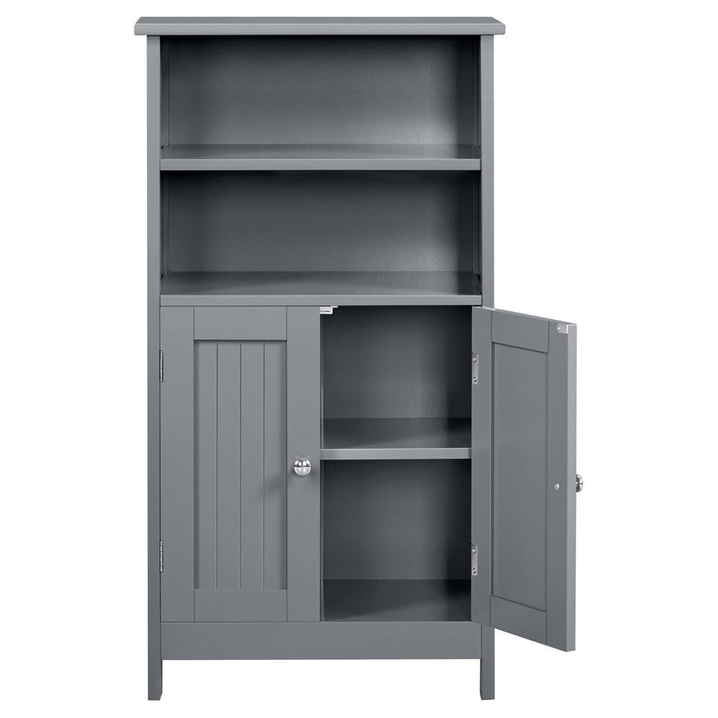 Suchen Sie einen praktischen Badezimmerschrank mit hoher Kapazität? Dieser multifunktionale Schrank kann Ihre Anforderungen erfüllen. Er ist aus den strapazierfähigen MDF-Holzplatten gefertigt, die für eine lange Nutzungsdauer sorgen. Der Badeschrank besteht aus zwei offenen Staufächern und einem Schrank mit dem höhenverstellbaren Einlegeboden hinter den Türen. Das abgestufte und verstellbare Design erleichtert Ihnen die Aufbewahrung der täglichen Gegenstände. Außerdem kann dieser multifunktionale Badschrank in der Küche, Wohnzimmer, Flur, Waschküche, Büro und dergleichen verwendet werden. Dank seines modernen und minimalistischen Designs passt es zu jedem Ihrer Räume.