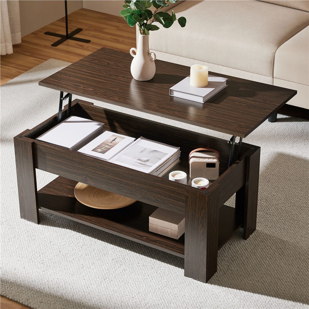 Mit seinem praktischen Lift-Top-Design und dem modernen Look wird dieser Kaffeetisch der Eyecatcher in Ihrem Zuhause sein! Mit der hochklappbaren Tischplatte kann dieser Couchtisch temporär als Arbeits- oder Esstisch verwendet werden, ohne sich nach vorne beugen zu müssen. Das versteckte Ablagefach unter der Tischplatte und die offene Ablage an der Unterseite bieten Sie genügenden Stauraum für die Alltagsgegenstände. Der Tisch besteht aus robusten MDF-Holzplatten, die für eine lange Lebensdauer sorgen. Dieser höhenverstellbare Kaffeetisch sorgt für Ordnung in Ihrem Wohnzimmer, Arbeitszimmer oder Büro.