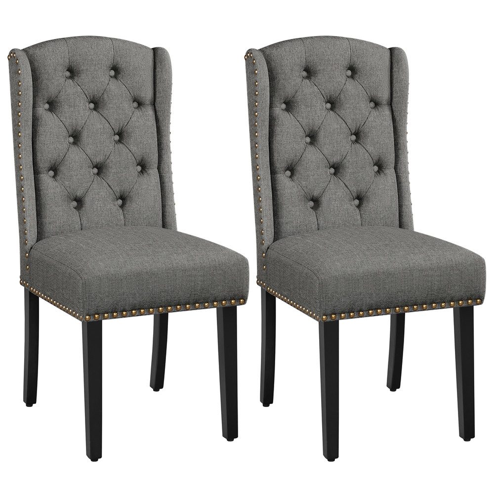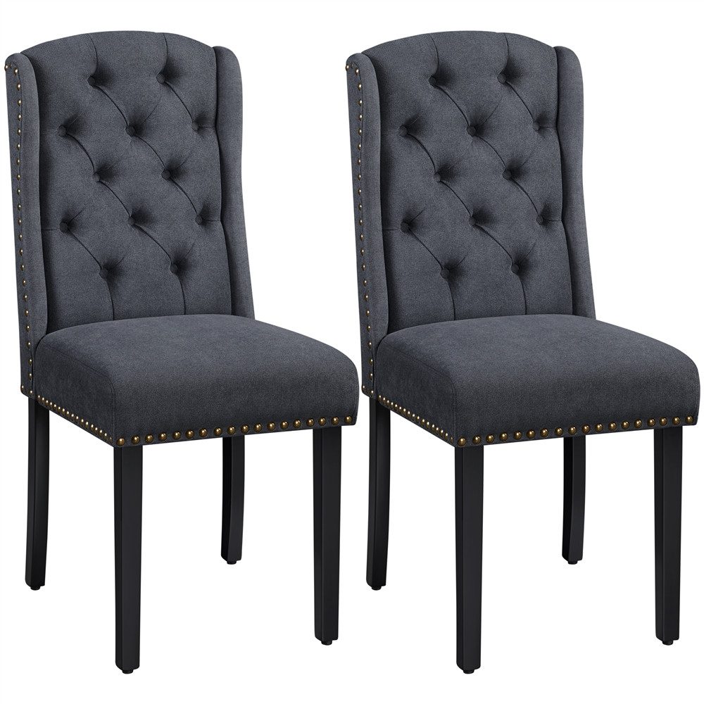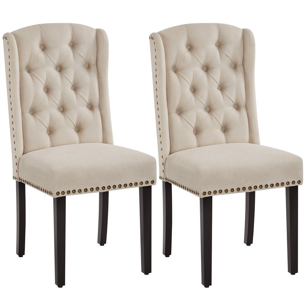 Die hohe Rückenlehne in klassischer Flügelform, das getuftete Design und die Verzierungen mit Messingnieten verleihen diesen beiden Stühlen einen Vintage-Stil. Die schwarzen Massivholzbeine der Stühle verleihen Charme und bieten gleichzeitig hohe Stabilität und Haltbarkeit. Diese beiden Stühle eignen sich ideal für das Esszimmer, Küche, Café, Hotel und Restaurant und dergleichen.