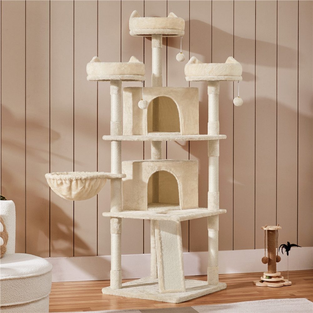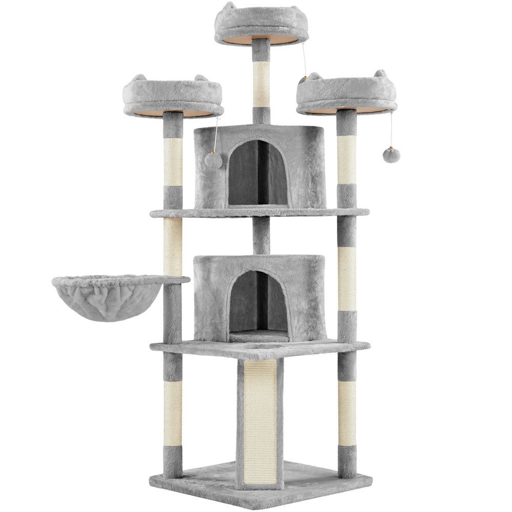 Dieser mehrstöckige Kratzbaum ist hoch genug, damit jede Ihrer Katzen einen bequemen Platz findet. Von oben nach unten besteht dieser Kratzbaum aus drei Aussichtsplattformen in Katzenohrenform, drei abnehmbaren Plüschbälle, zwei kuscheligen Katzenhöhlen, einer bequemen Liegemulde und einem Kratzbrett.