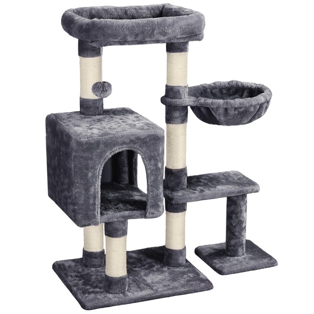 Auf der oberen Aussichtsplattform können die Katzen das Revier beobachten. Die Katzenhöhle und die Liegemulde sorgen für ein komfortables Ruhen und Schlafen. Die Sisalstämme fördern das positive Kratzverhalten und sie lenken die Katzen von Möbel, Teppichen und Vorhängen ab. Mit der Размер von 80,5 cm L × 39,5 cm B × 96,5 cm H eignet sich dieser mehrstöckige Kratzbaum für die kleinen Wohnungen.