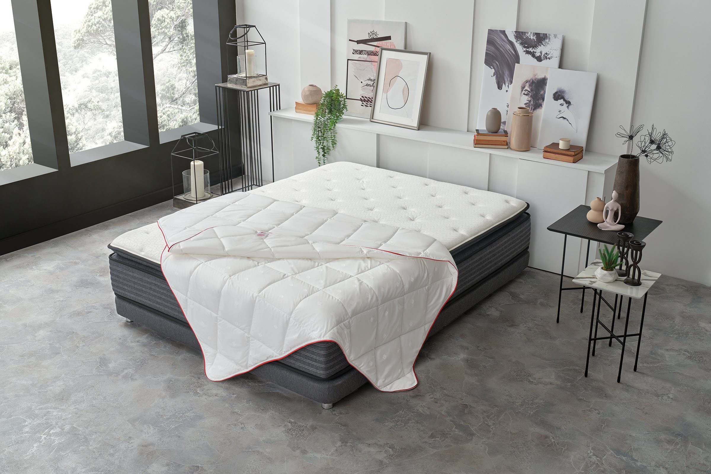 Der Bezug besteht aus 100% Baumwollfaser – atmungsaktiv, hautfreundlich und angenehm weich. Die Füllung aus DACRON® 95, einer innovativen Synthetikfaser der neuesten Generation, vereint Leichtigkeit und Strapazierfähigkeit. Die feinen, widerstandsfähigen Cluster-Fasern lassen sich leicht aufschütteln und sorgen für eine langanhaltende Formstabilität. Der hohe Luftanteil innerhalb der Füllung bietet eine effektive Isolierung für angenehme Wärme die ganze Nacht. Gleichzeitig passt sich das Material sanft an die Körperkonturen und Bewegungen an – für stabilen Halt und optimalen Schlafkomfort. Pflegeleicht und hygienisch: Die Decke ist bei bis zu 95°C waschbar und damit ideal für höchste Ansprüche an Sauberkeit und Frische.