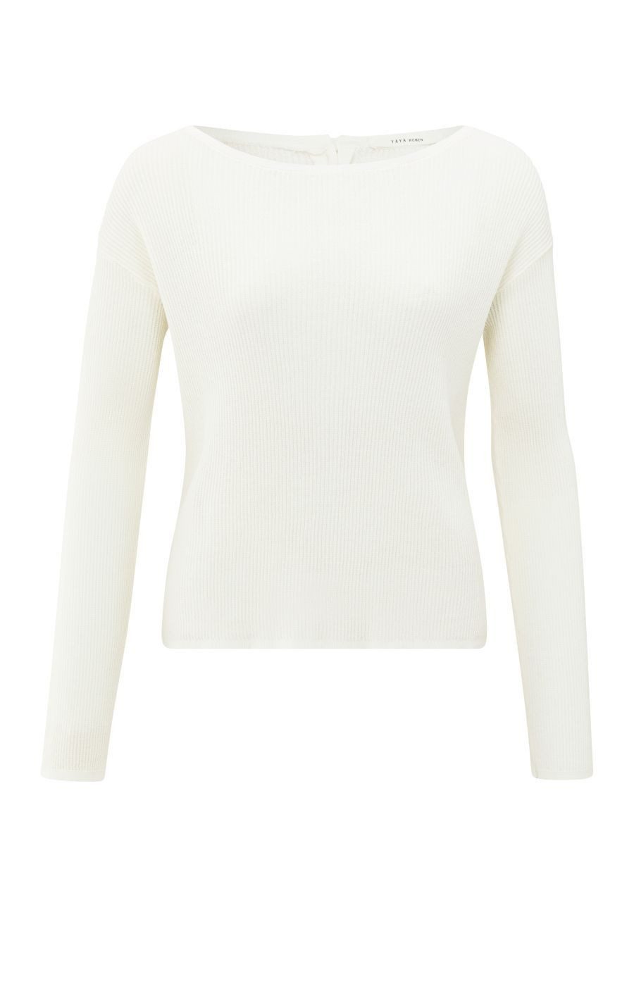 Dieser elegante Cardigan ist aus weichem, fein geripptem Strick gefertigt. Er hat einen Rundhalsausschnitt, eine eng anliegende Passform und einen Knopfverschluss auf der Rückseite, der ihm eine raffinierte, unerwartete Note verleiht. Der Cardigan ist die perfekte Wahl für einen femininen, stilvollen Lagenlook
