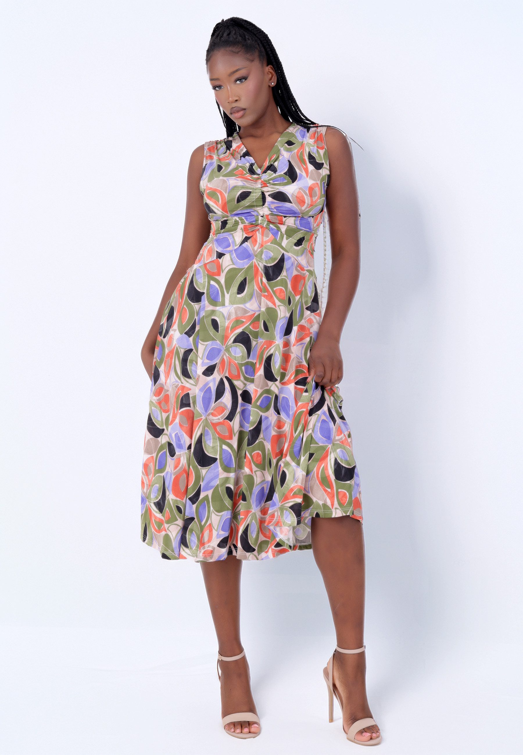 Der feminine V-Ausschnitt und die dezente Raffung im Brustbereich setzen Ihre Silhouette gekonnt in Szene, während der schwingende Rockteil für eine charmante Leichtigkeit bei jeder Bewegung sorgt. Ob beim Stadtbummel, Gartenfest oder im Urlaub – mit diesem Kleid ziehen Sie garantiert alle Blicke auf sich.