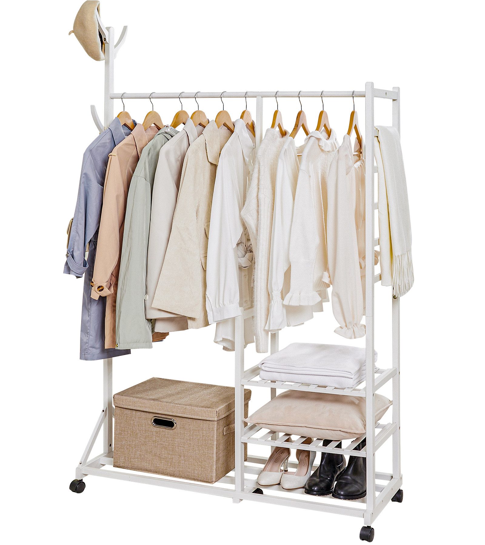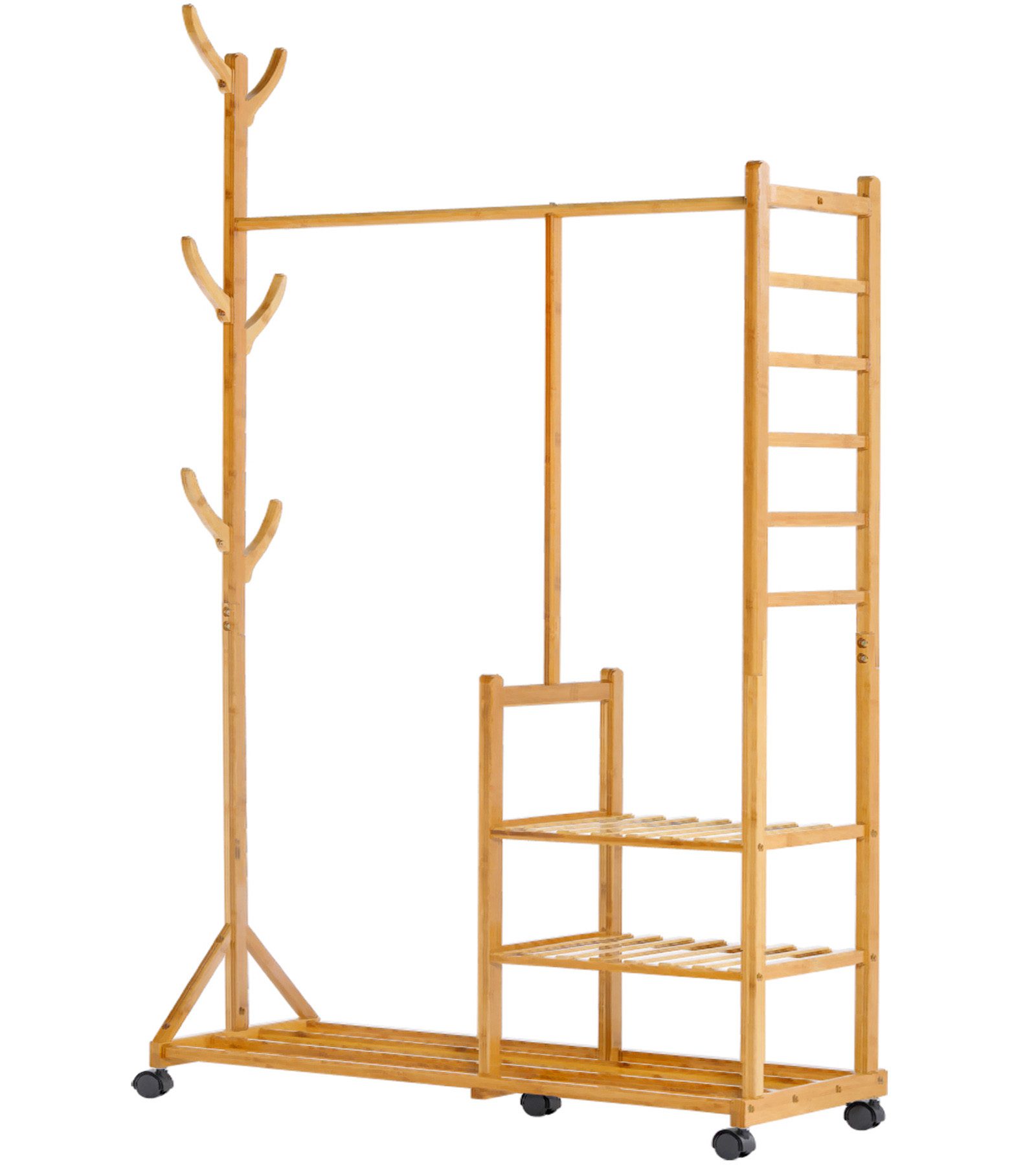 Hab mir das als Garderobenständer geholt, da er Räder hat. Der Aufbau ist einfach, die Anleitung verständlich, alle Teile sind beschriftet. Es hat nichts gefehlt. Hatte mich ein wenig in der Höhe verschätzt, aber das ist mein Fehler. Всеs in allem ist es ein Guter geräumiger und stabiler Kleiderständer.