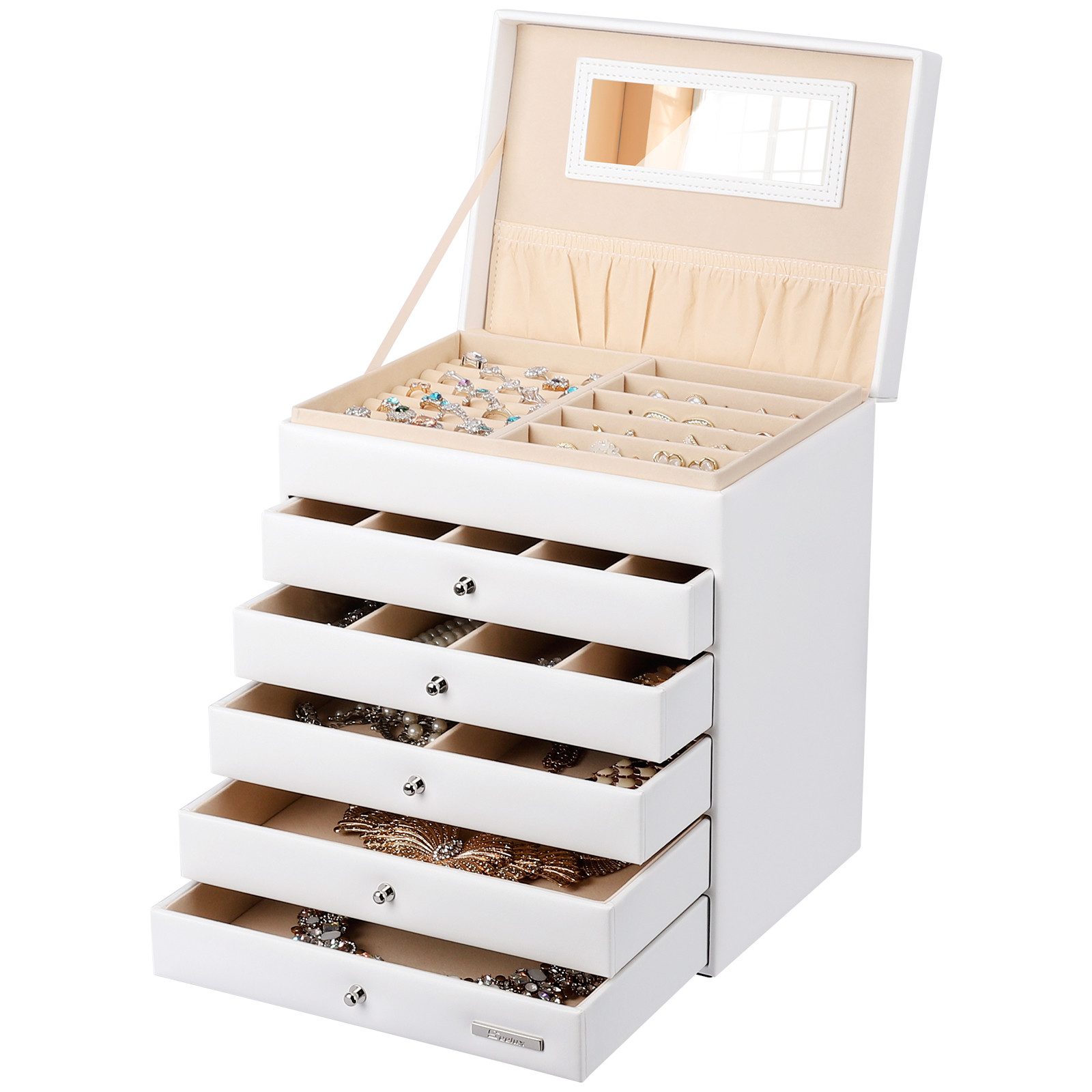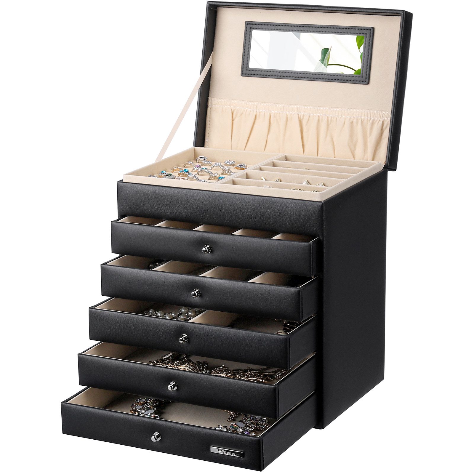 Mit 6 Ebenen und durchdachten Trennwänden bietet das Schmuckkästchen ausreichend Platz für Ringe, Halsketten, Armreifen, Ohrringe und Armbänder. Ihre Schmuckstücke sind stets sicher und ordentlich verstaut.