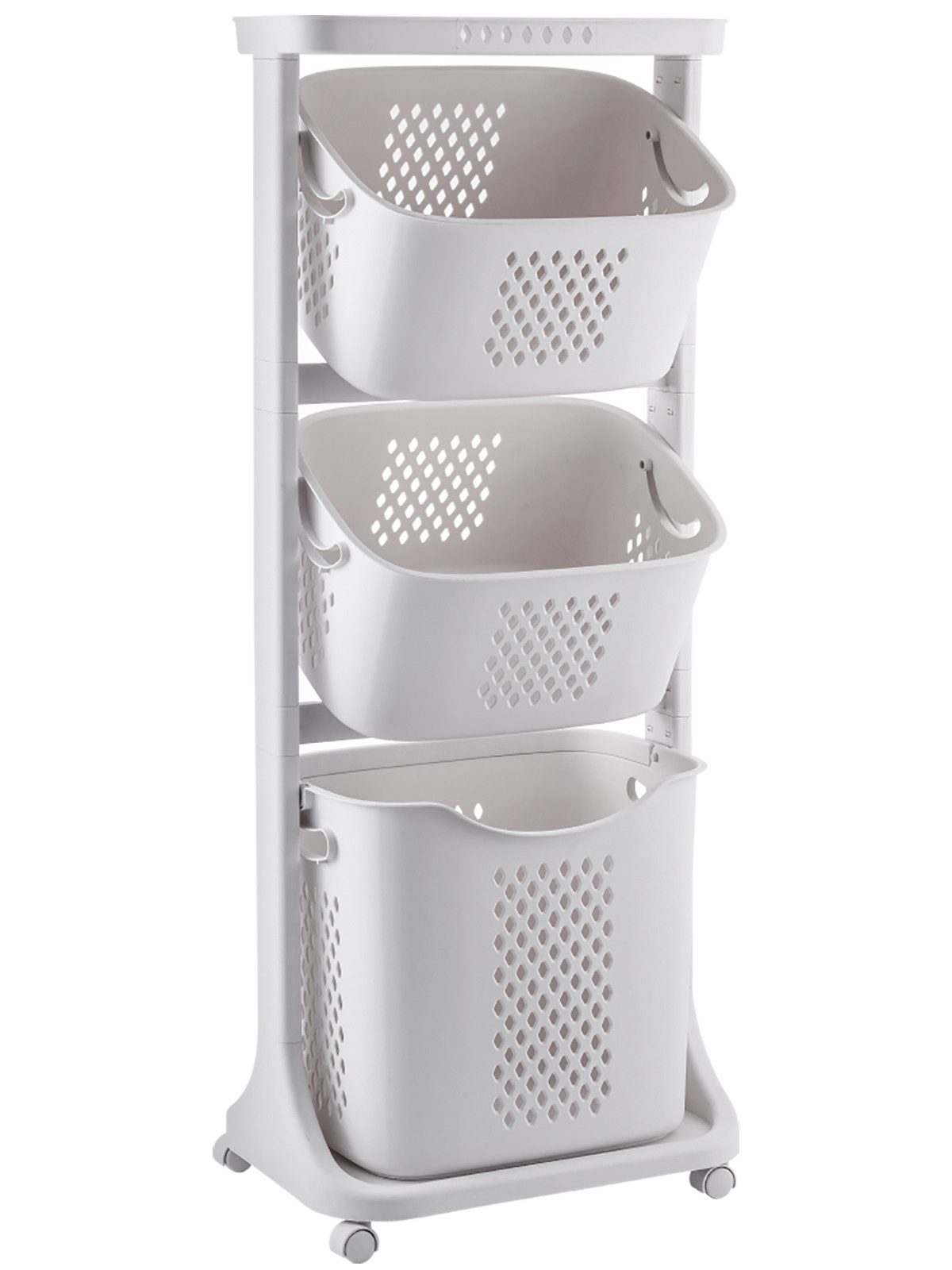 Obere Etage für Waschmittel, mittlere Körbe für Dreckwäsche mit einstellbarem Neigungswinkel, unterer Korb mit großem Fassungsvermögen und Griffen, freibewegbar.