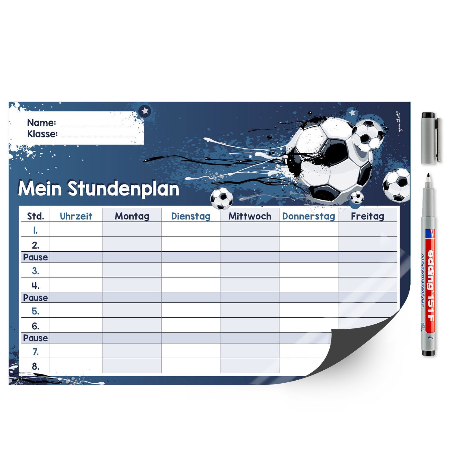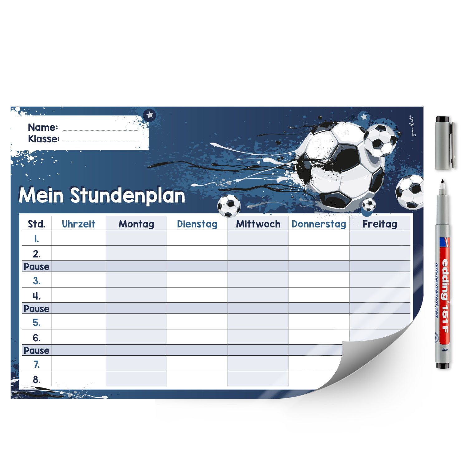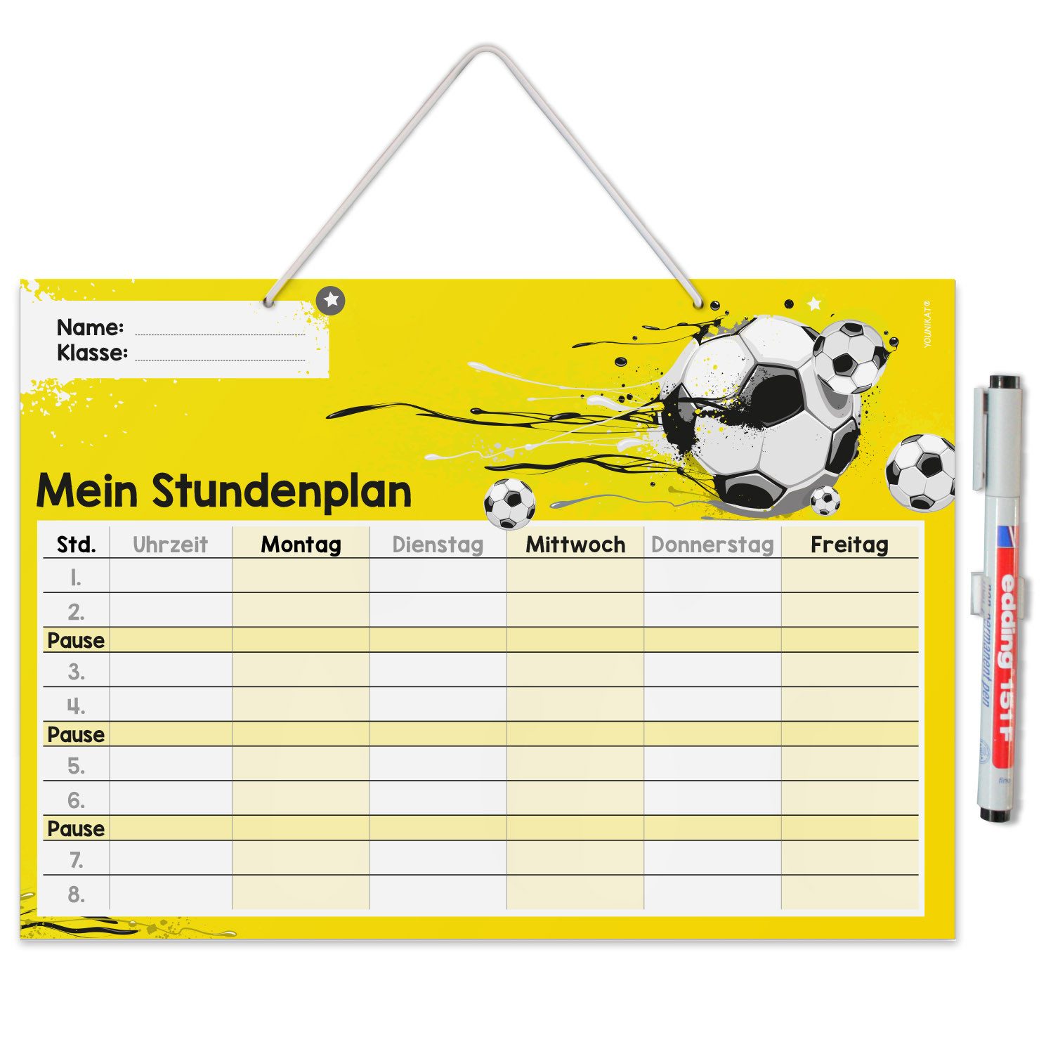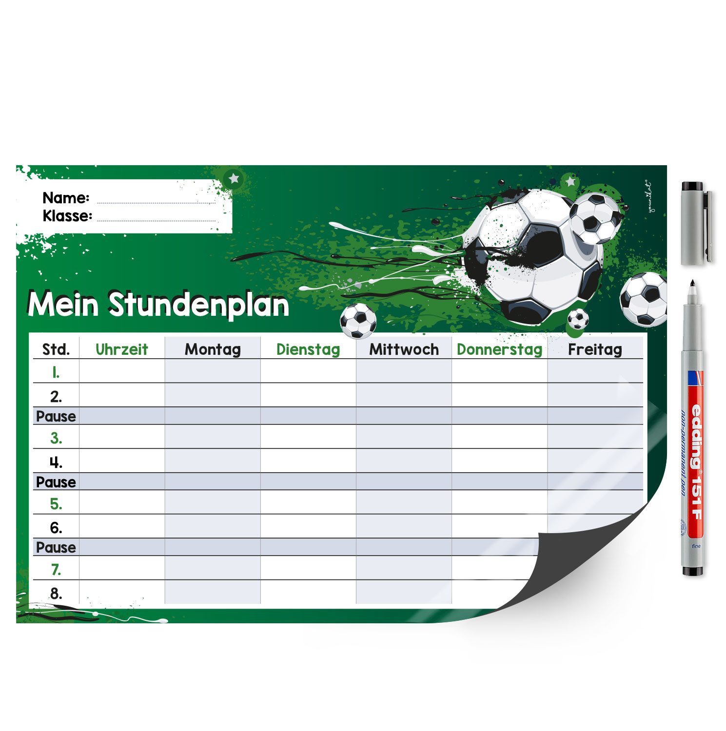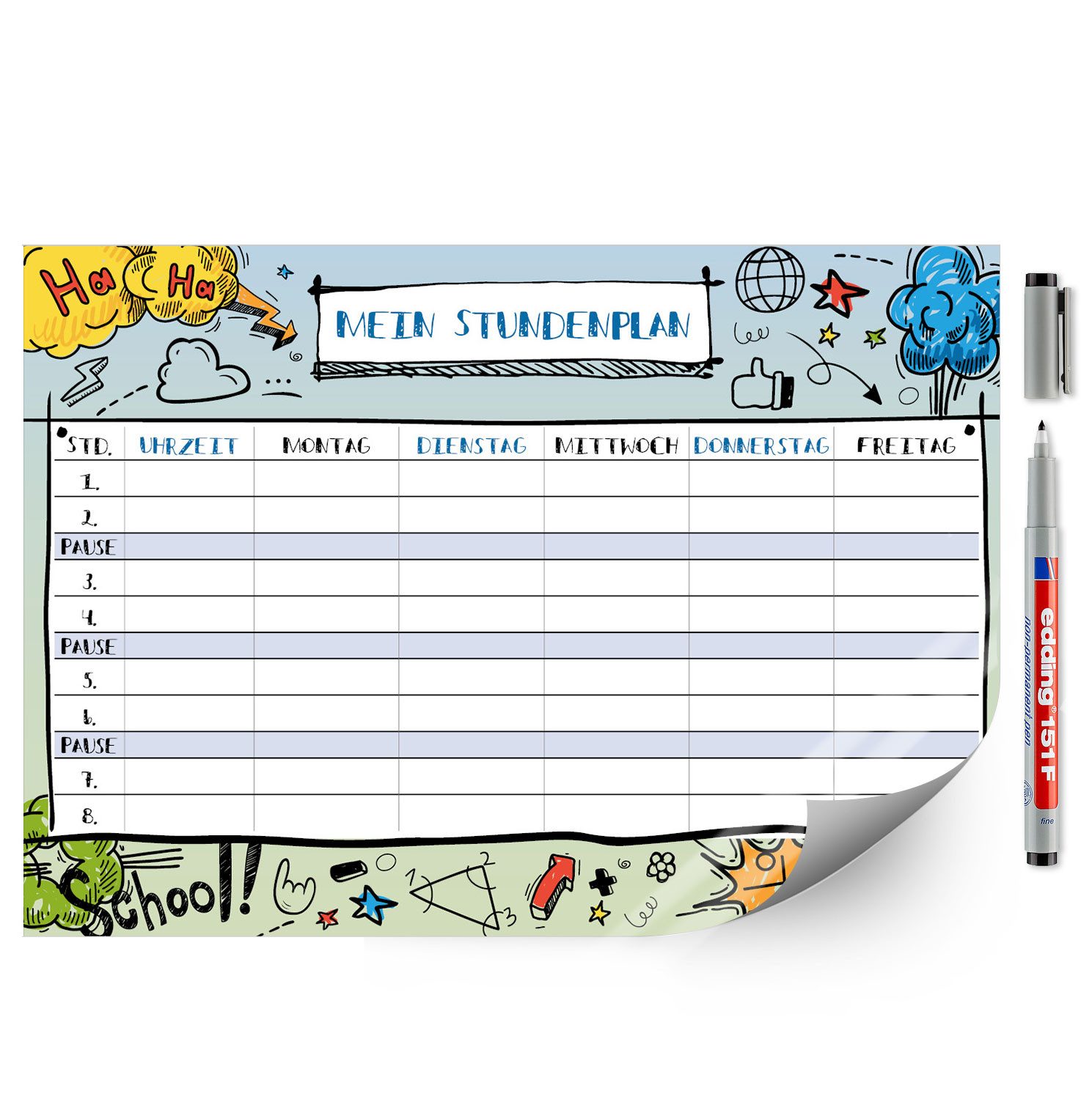 Ausstattung | 1 Stundenplan im Format DIN A4 (210 x 297 mm), inklusive Stift |