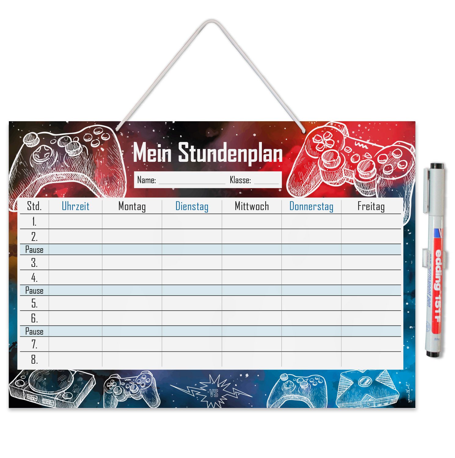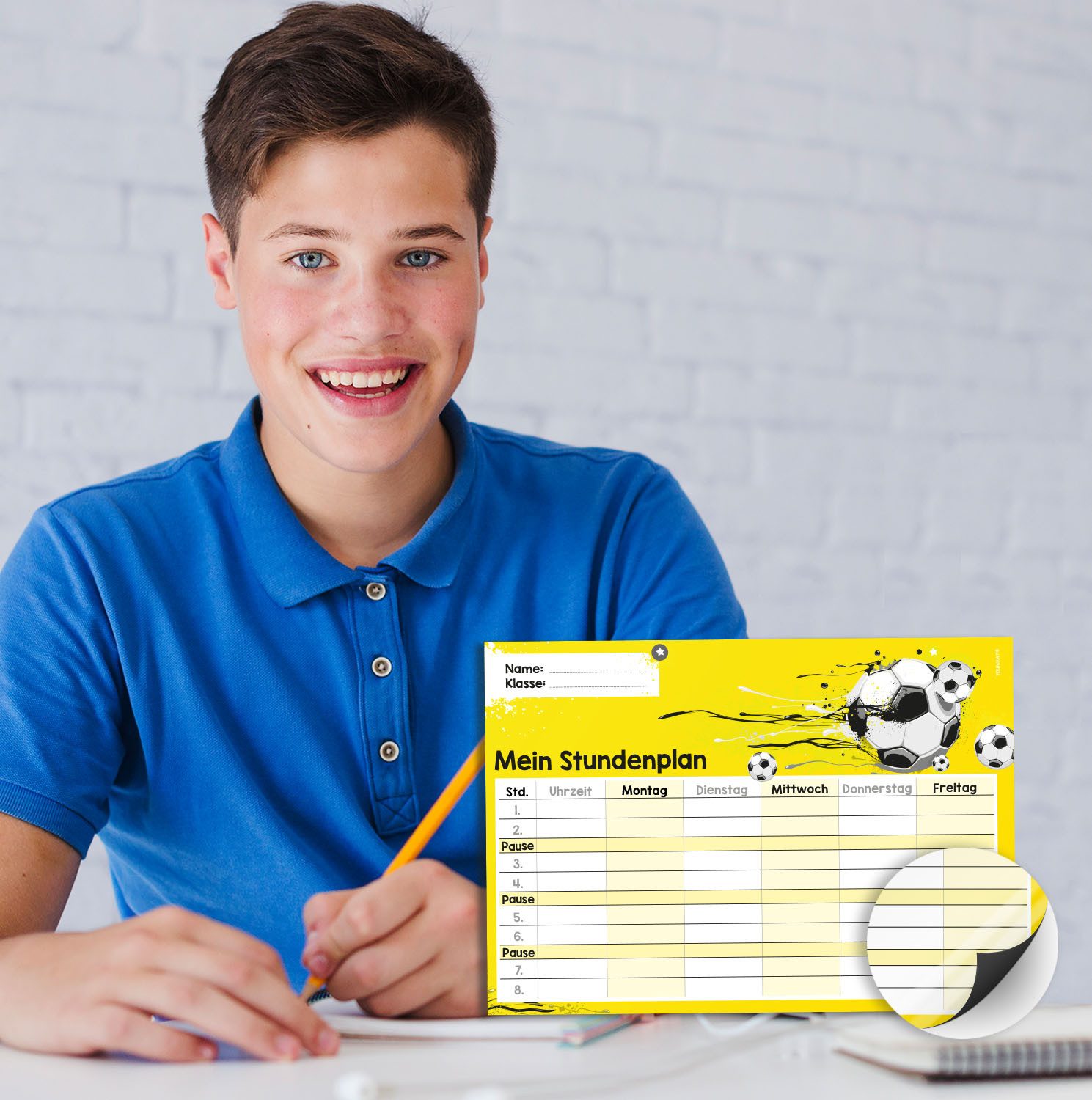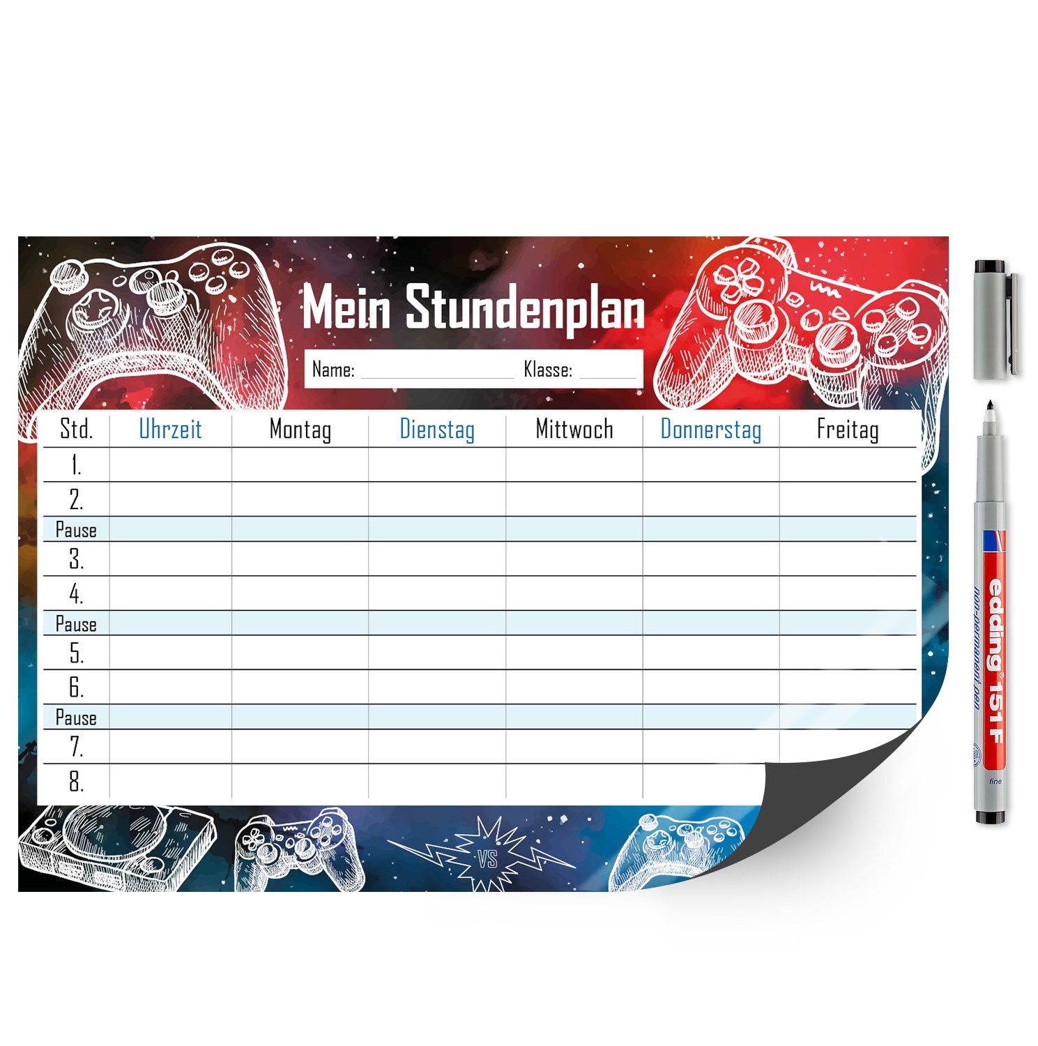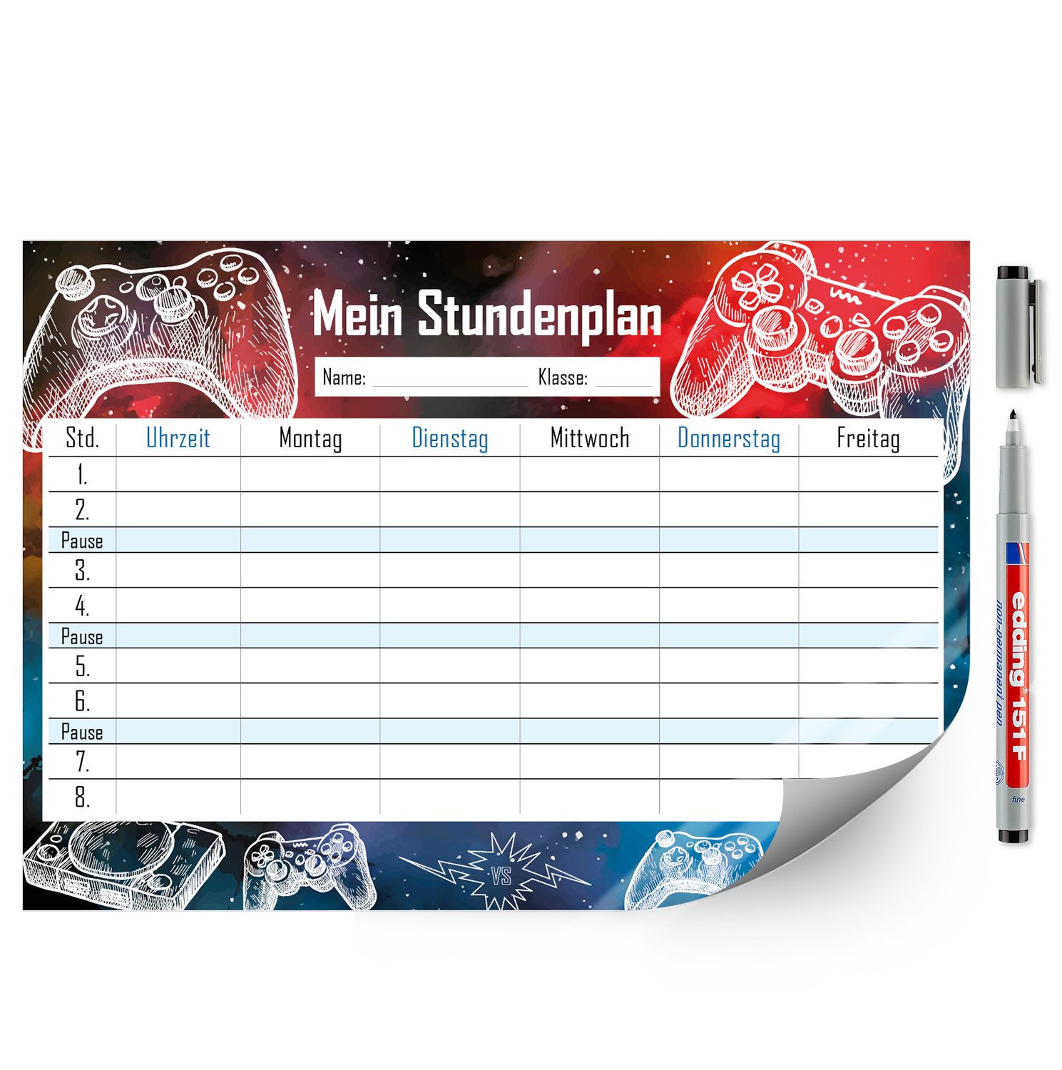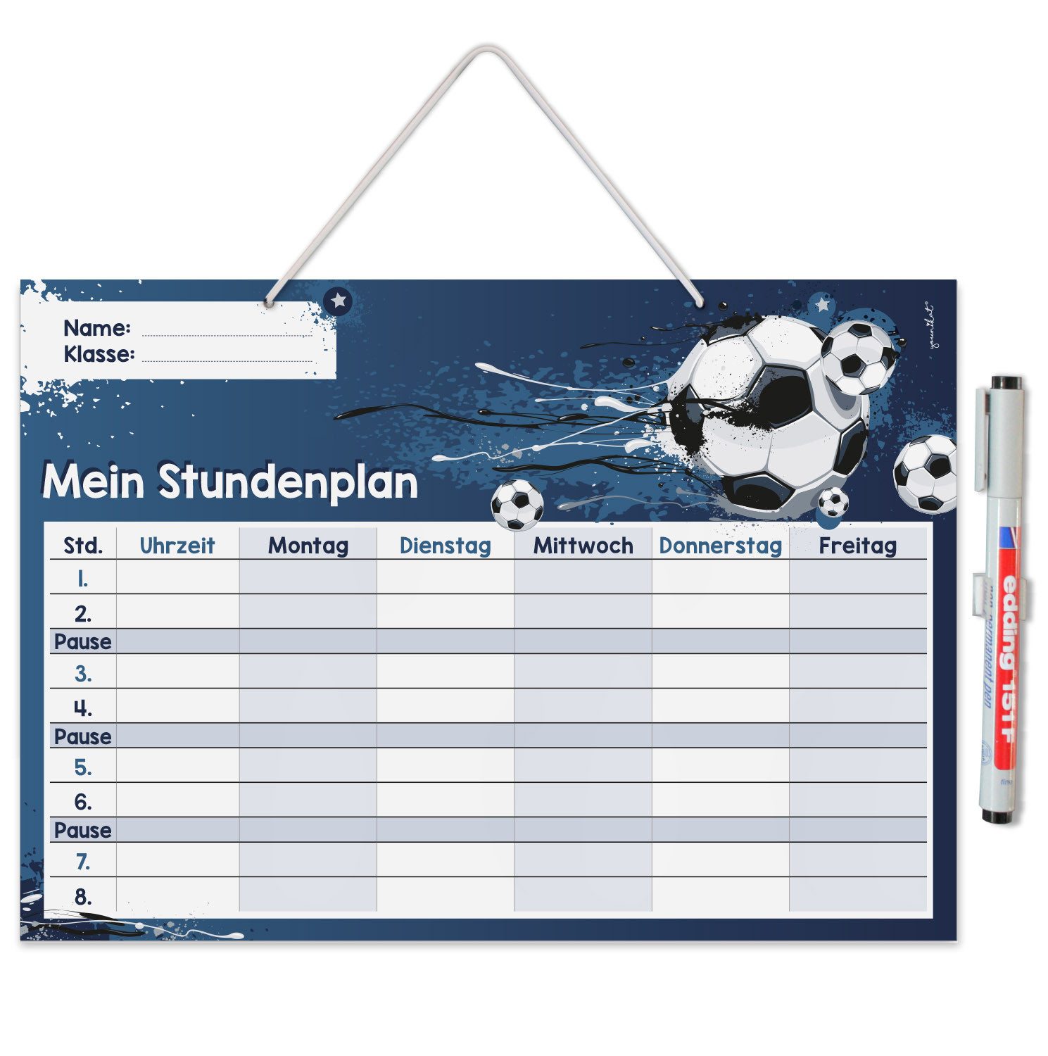 Ausstattung | 1 Stundenplan im Format DIN A4 (210 x 297 mm), inklusive Stift |