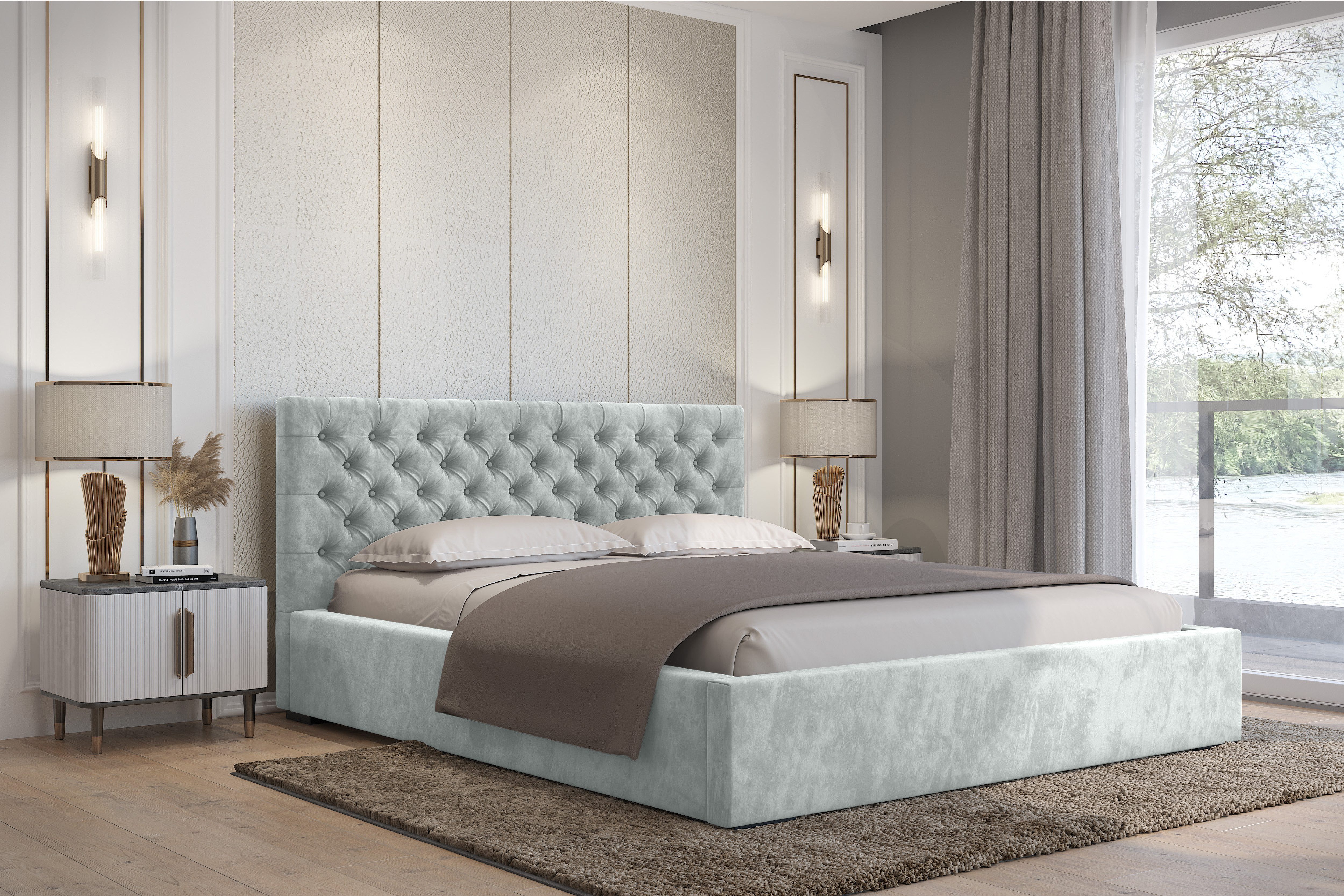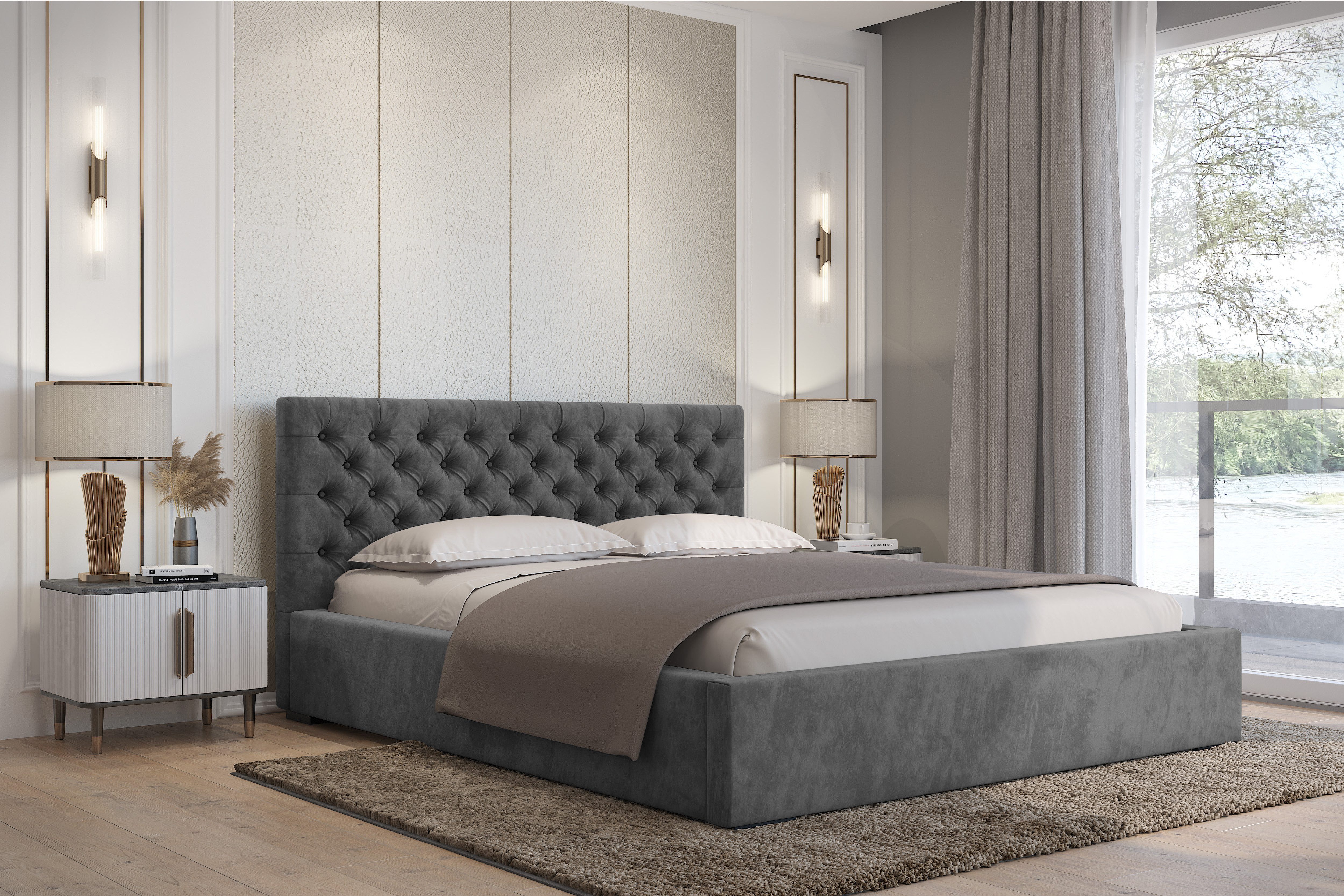 inkl. Bettkasten inkl. Holzlattenrost Widerstandsfähiger und angenehm zu berührender Stoff Kopfteil mit Steppung und gepolsterter Korpus ohne Matratze ohne Nachttisch