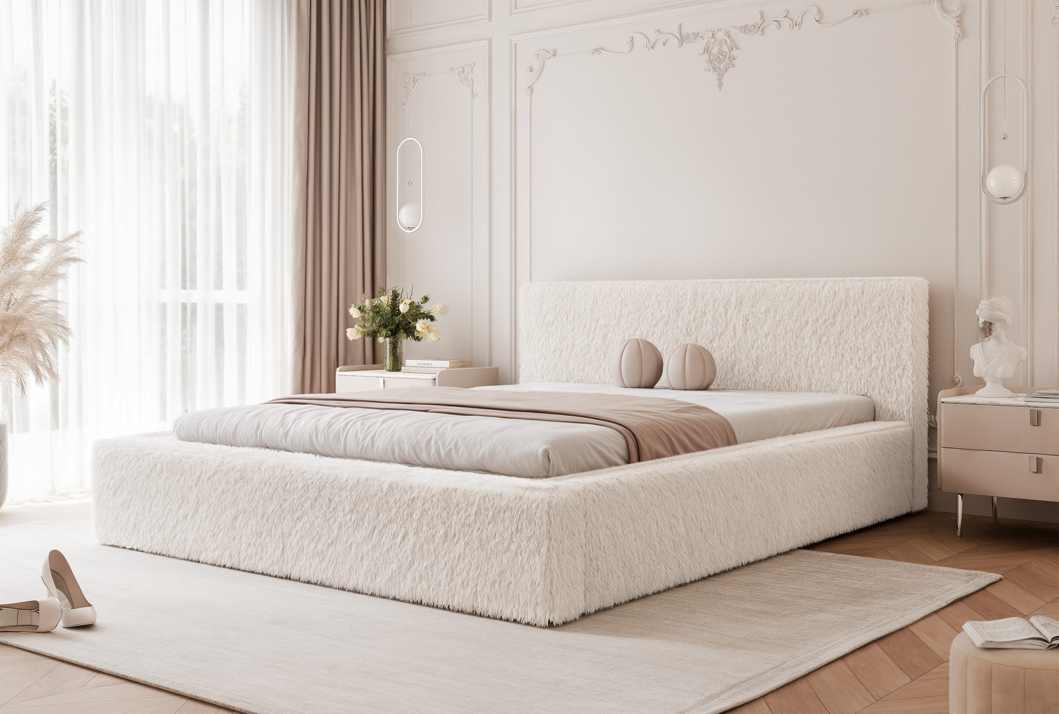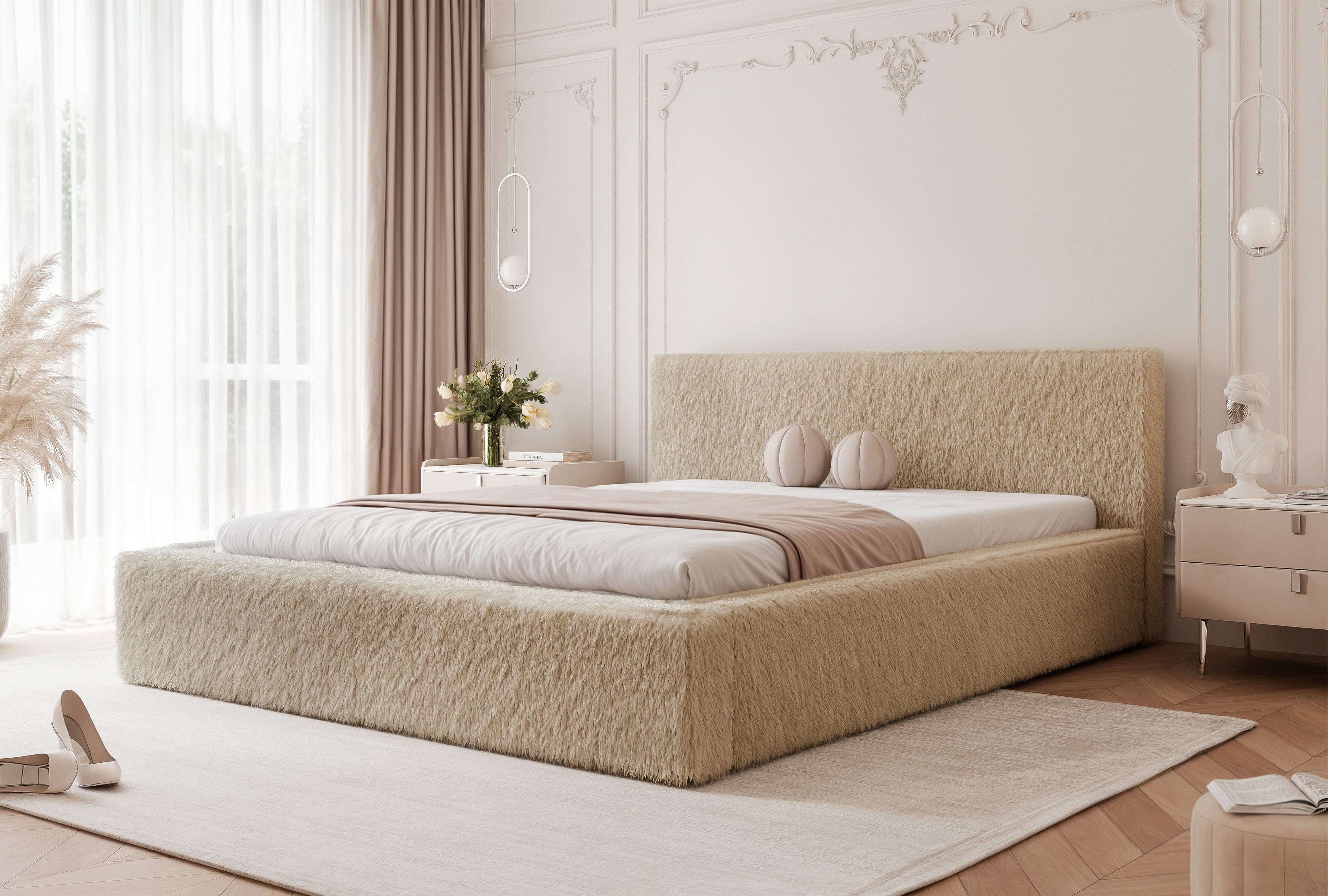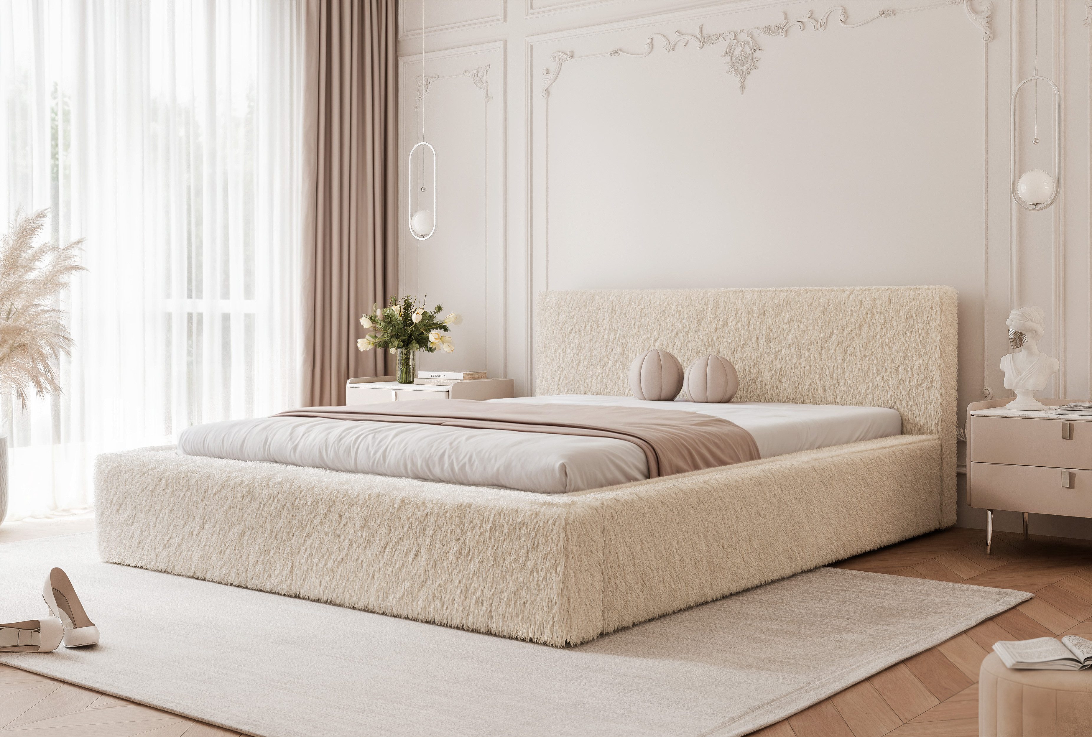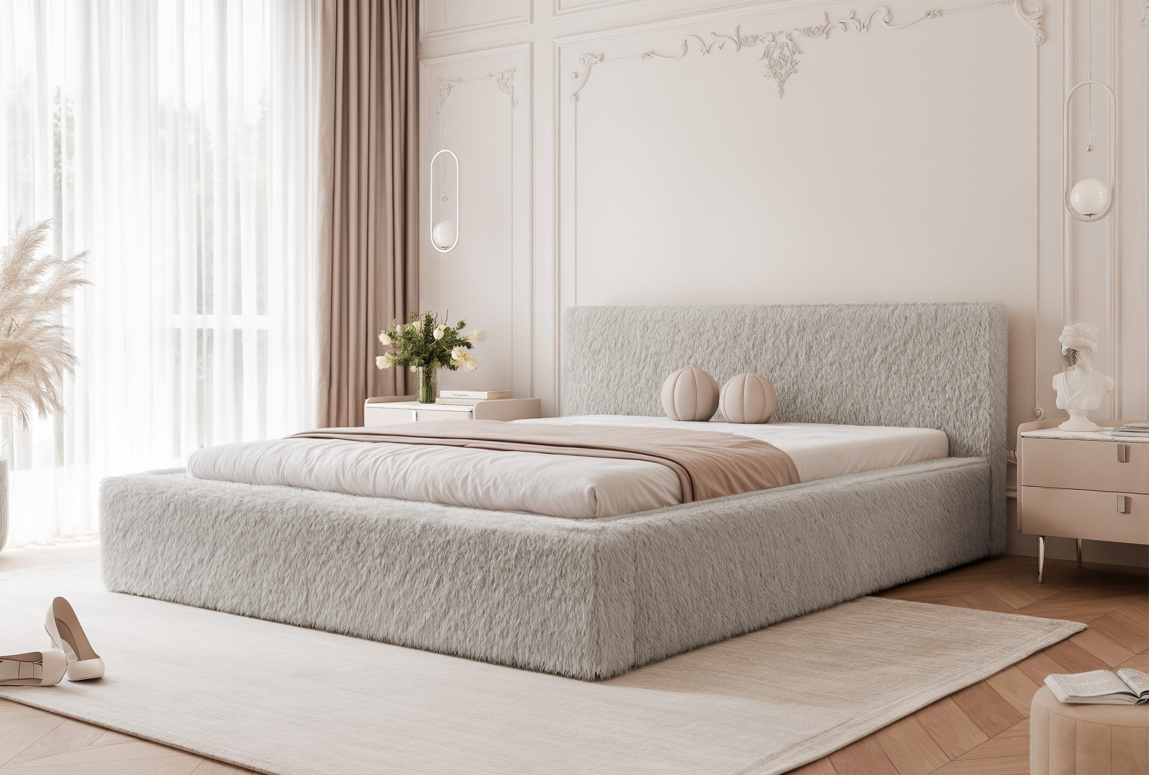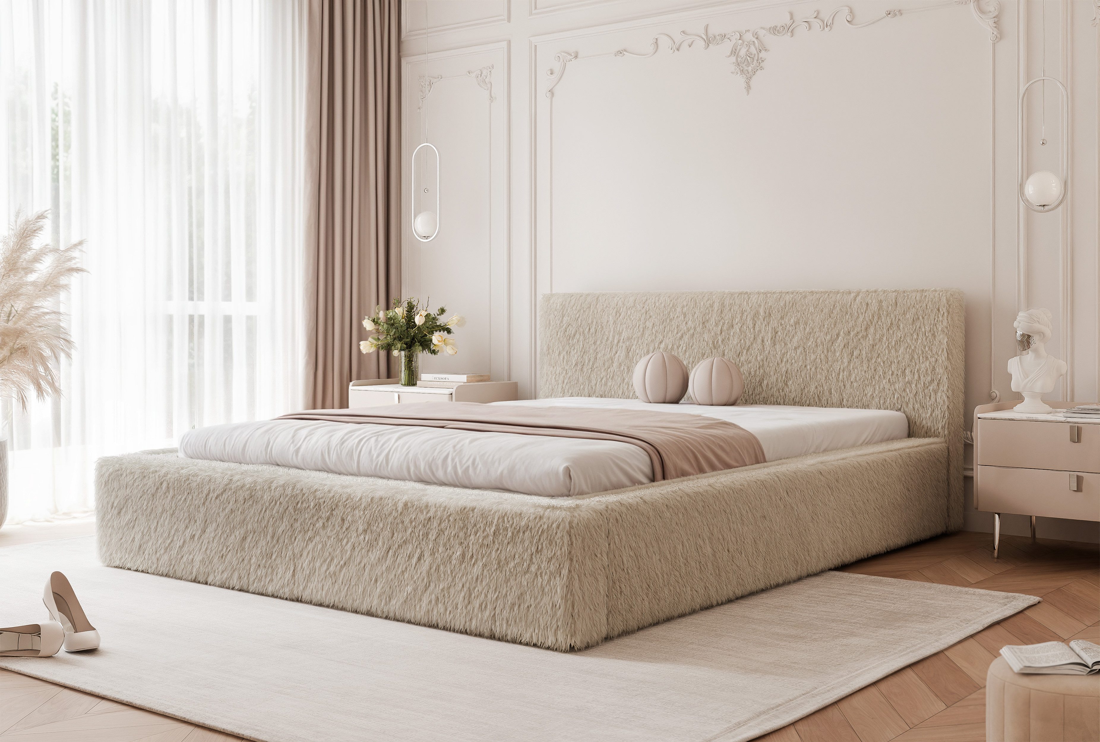 Das Fluffy Polsterbett vereint stilvolles Design mit außergewöhnlichem Komfort und wird zu einem luxuriösen Mittelpunkt in Ihrem Schlafzimmer. Mit seinem flauschigen, fellartigen Bezug schafft es eine elegante und einladende Atmosphäre – ideal für moderne Schlafzimmer.