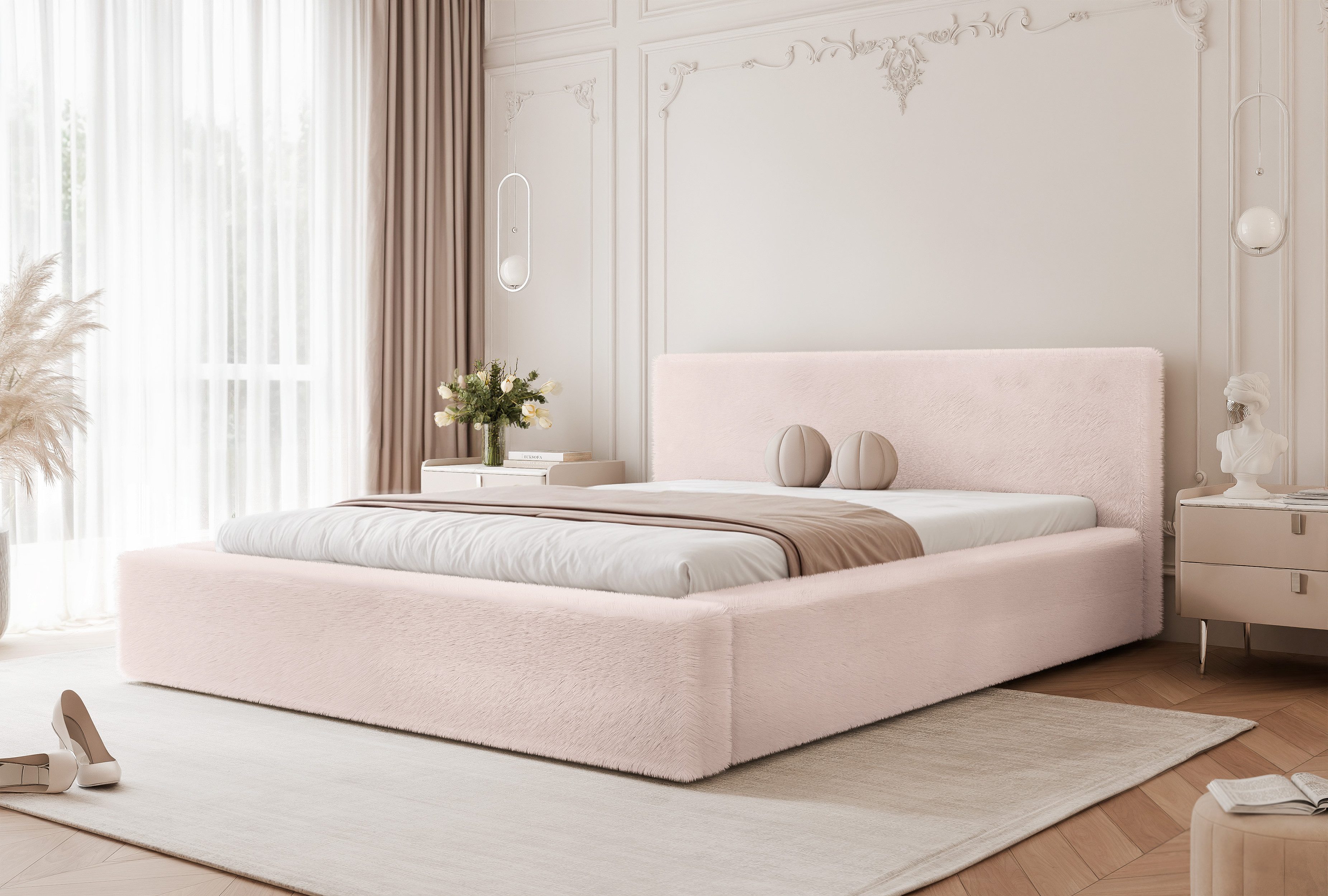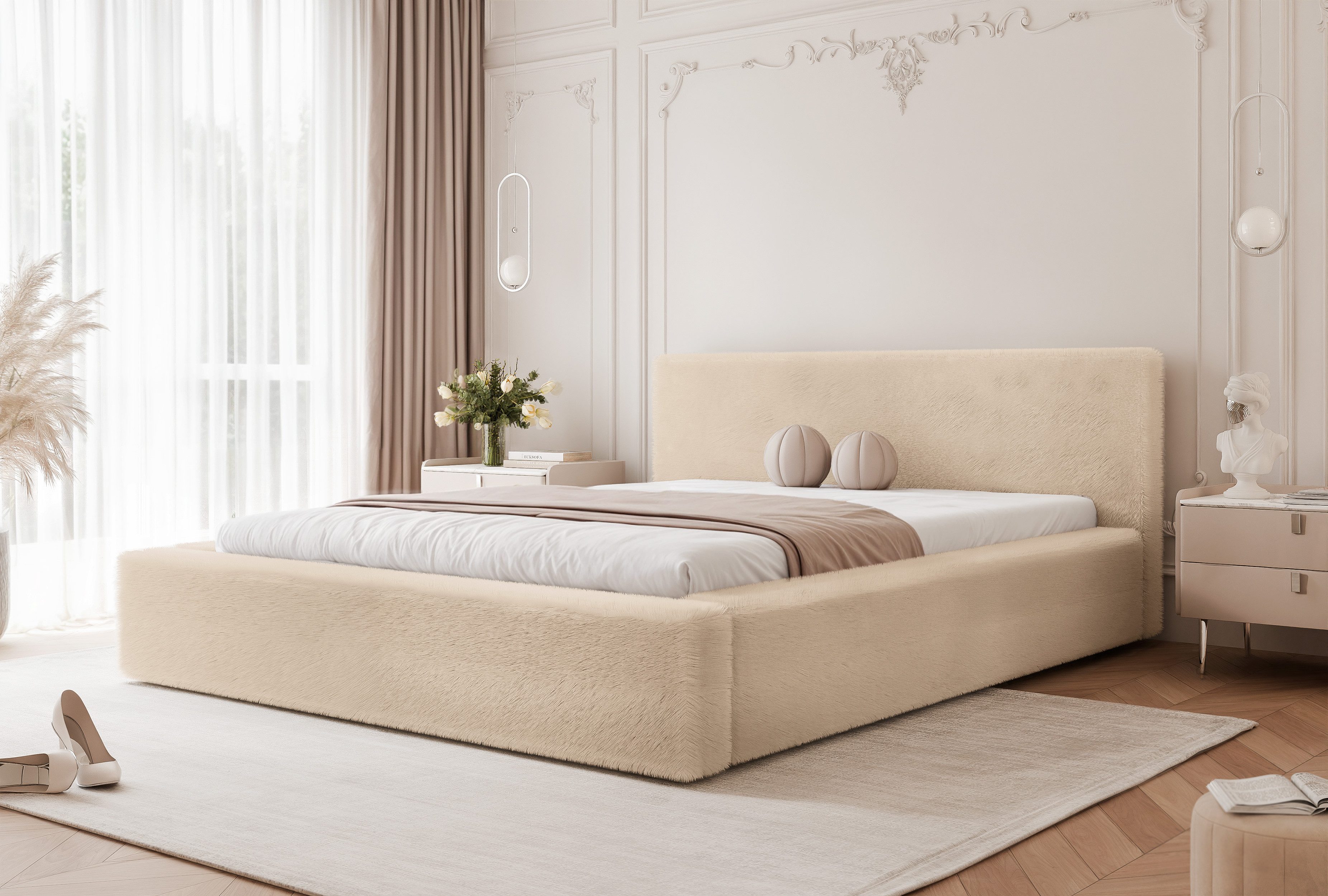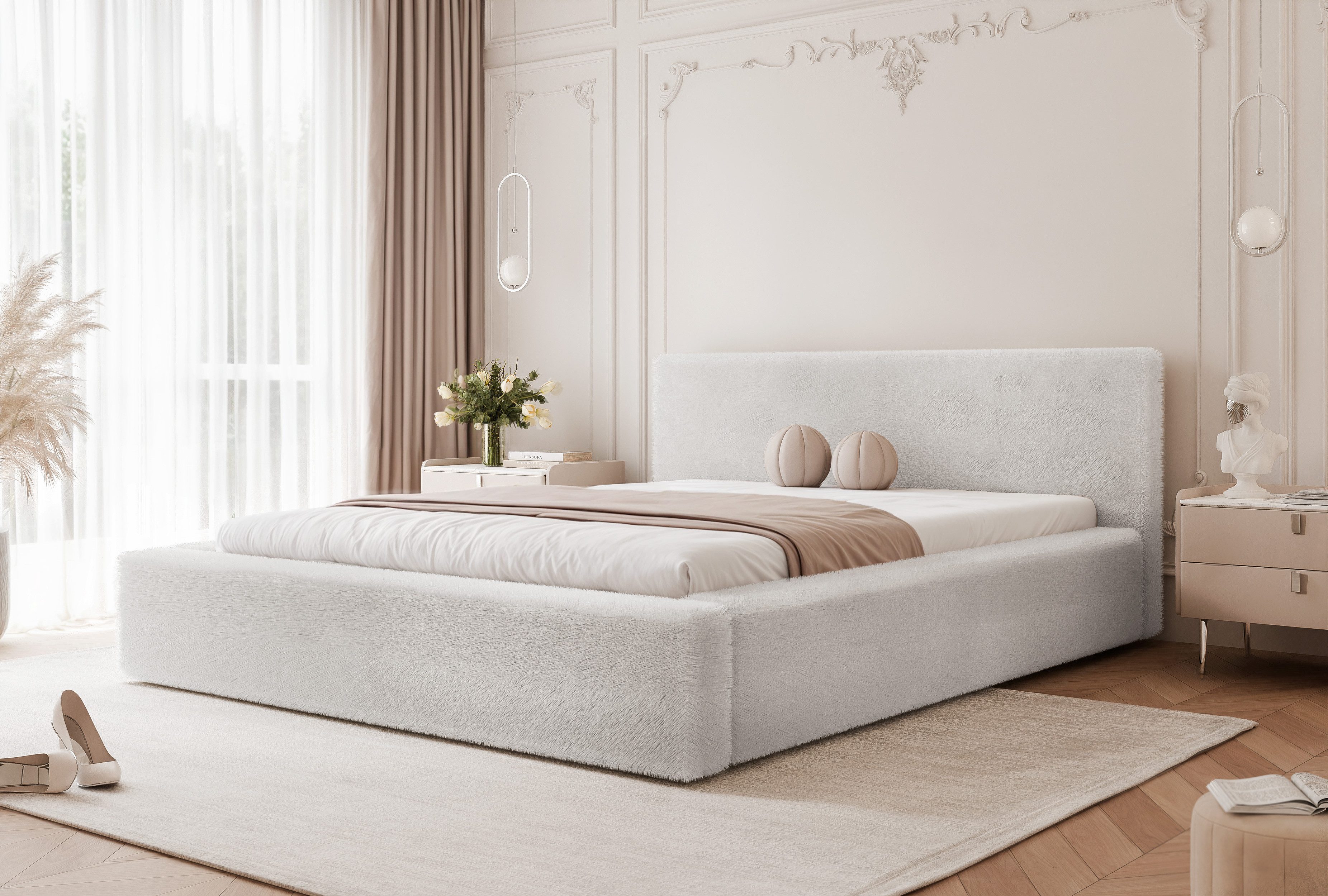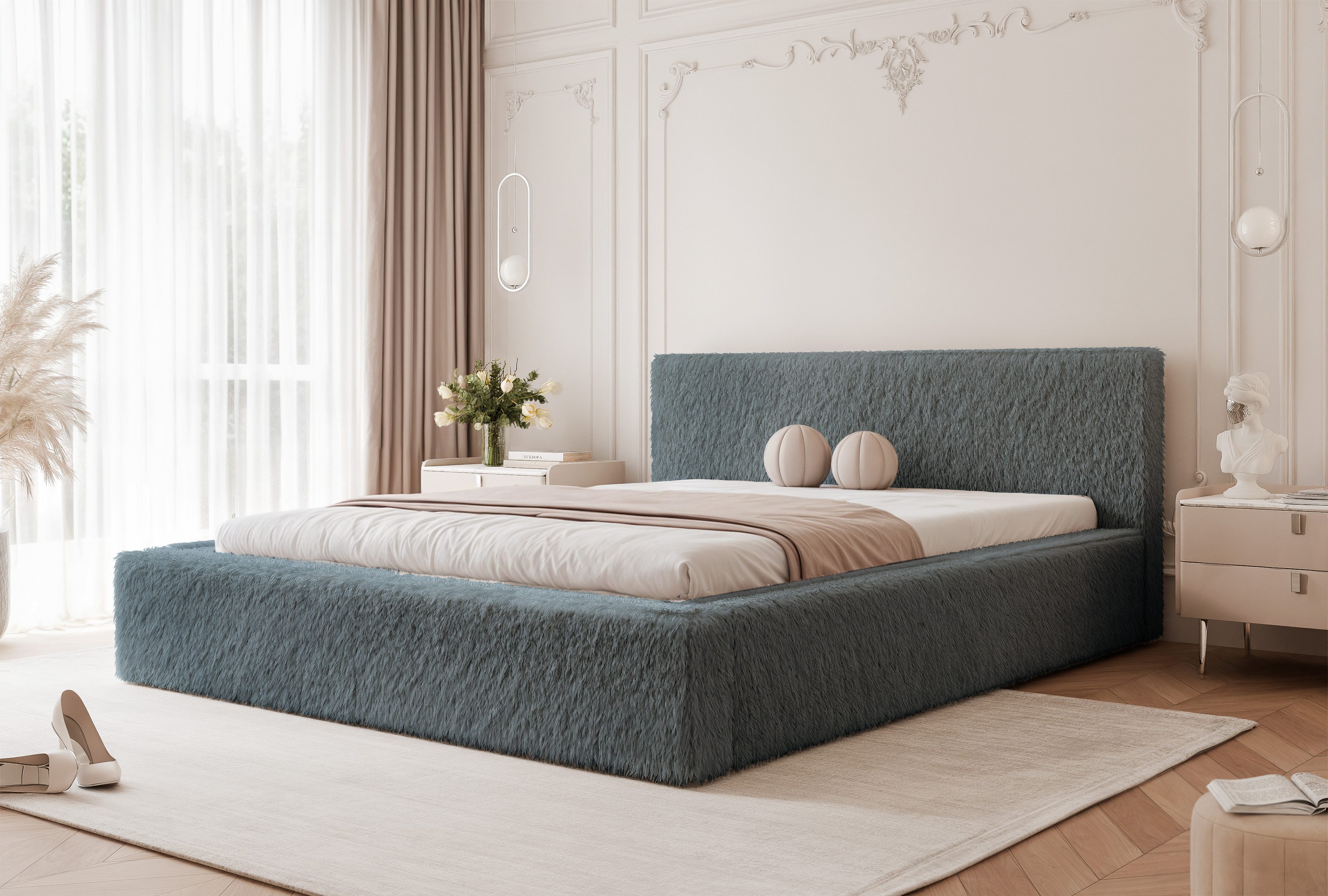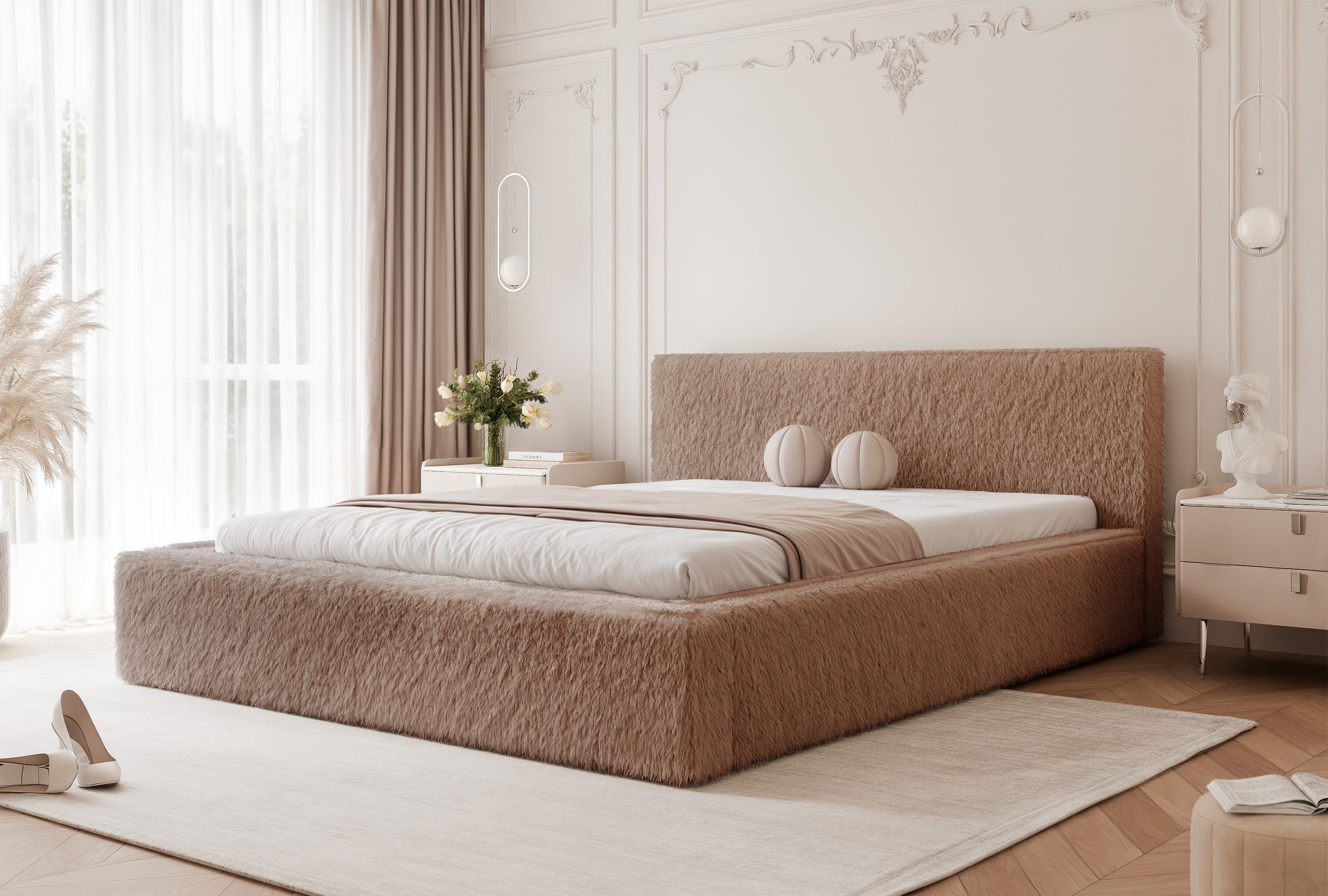 Das Fluffy Polsterbett vereint stilvolles Design mit außergewöhnlichem Komfort und wird zu einem luxuriösen Mittelpunkt in Ihrem Schlafzimmer. Mit seinem flauschigen, fellartigen Bezug schafft es eine elegante und einladende Atmosphäre – ideal für moderne Schlafzimmer.