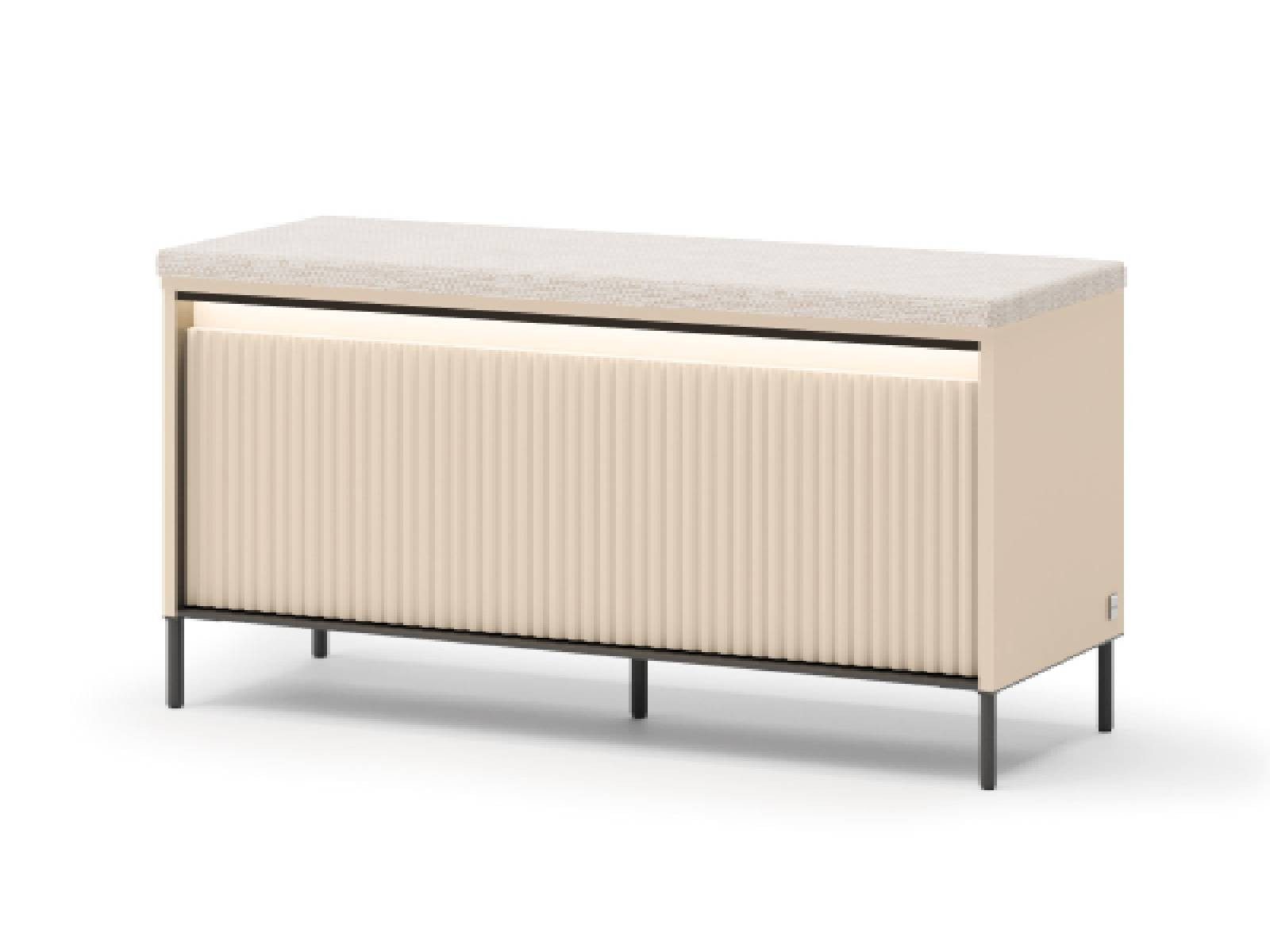 Praktische Flur-/Garderobenbank für Diele und Eingangsbereich. Die TG-05 kombiniert eine bequeme Sitzfläche mit Stauraum – ideal zum Schuhe anziehen und schnellen Verstauen im Alltag. Das zeitlose Duo Beige Sand/Schwarz sorgt für einen aufgeräumten, modernen Look; die LED-Beleuchtung verbessert die Übersicht im Innenraum.