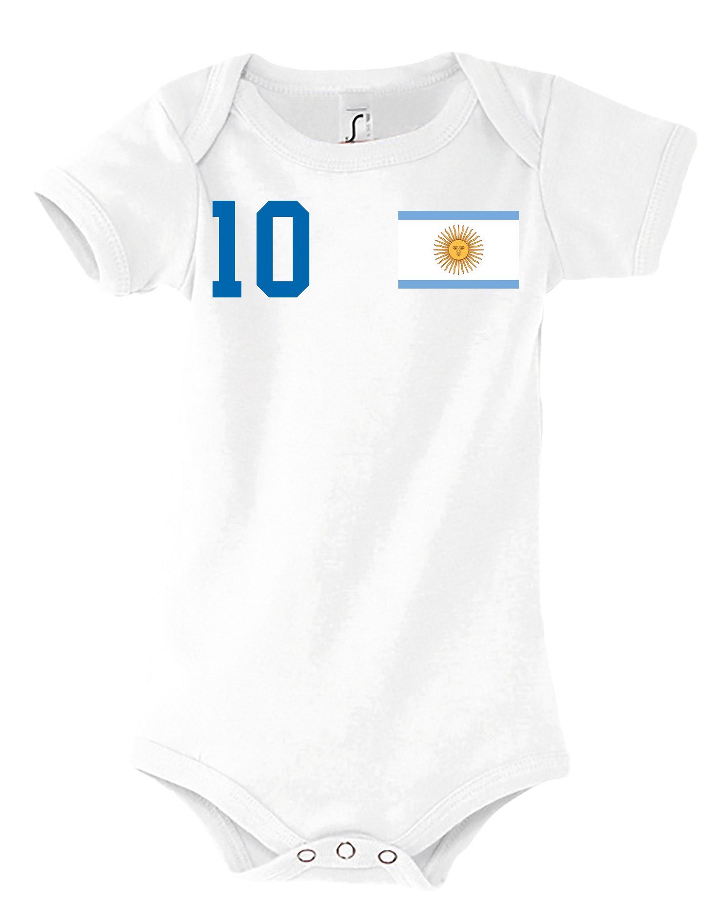 Tolles Motiv zur Fußball WM oder Confed Cup als 12. Mann: Der süße Baby Kurzarm Strampler für Jungen und Mädchen im sportlichen Argentinien Fußball Trikot Look ist hochwertig verarbeitet und hat einen hohen Tragekomfort. Setzen Sie ein Statement mit diesem lustigen Strampler und zeigen Sie Flagge zur Weltmeisterschaft oder Confed Cup als 12. Mann. Der mit Wappen und Flagge verzierte Print Argentinien Baby Body eignet sich für Sport Veranstaltungen wie Fußball WM 2022, Basketball und Olympia. Der Fan Body eignet sich perfekt als Geschenk für Freunde, Familie, Kinder, Sohn, Tochter, Neffe und Nichte zum Geburtstag, Nikolaus, Weihnachten und Ostern als persönlicher Geschenkartikel.