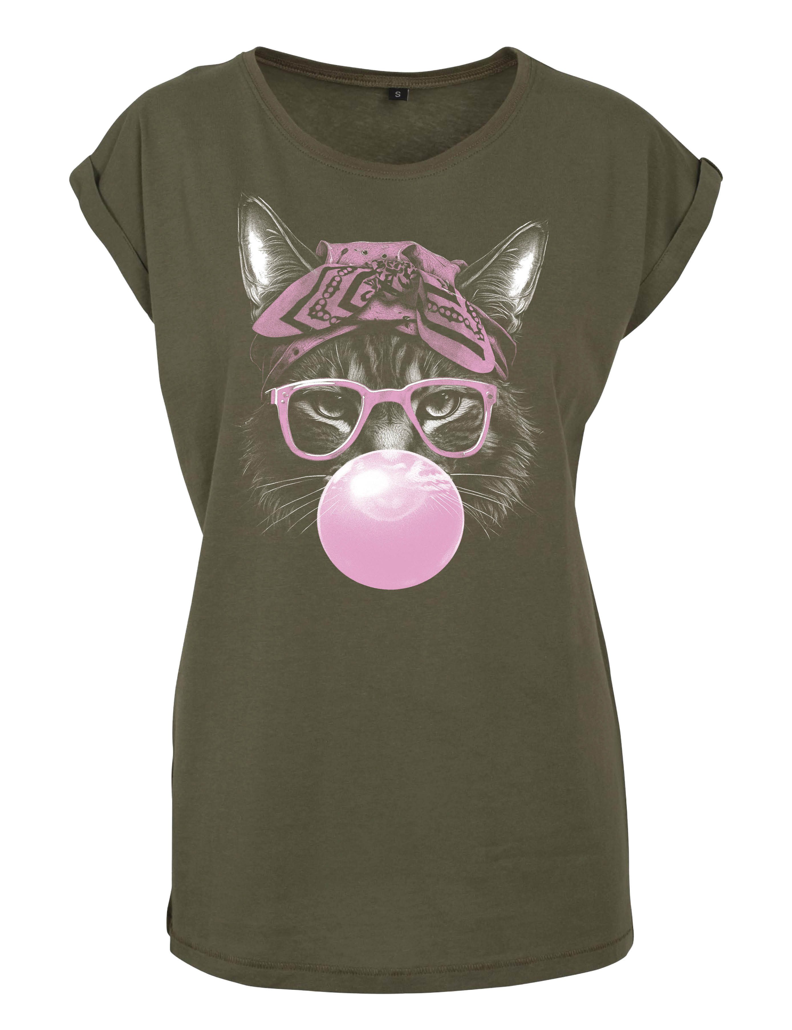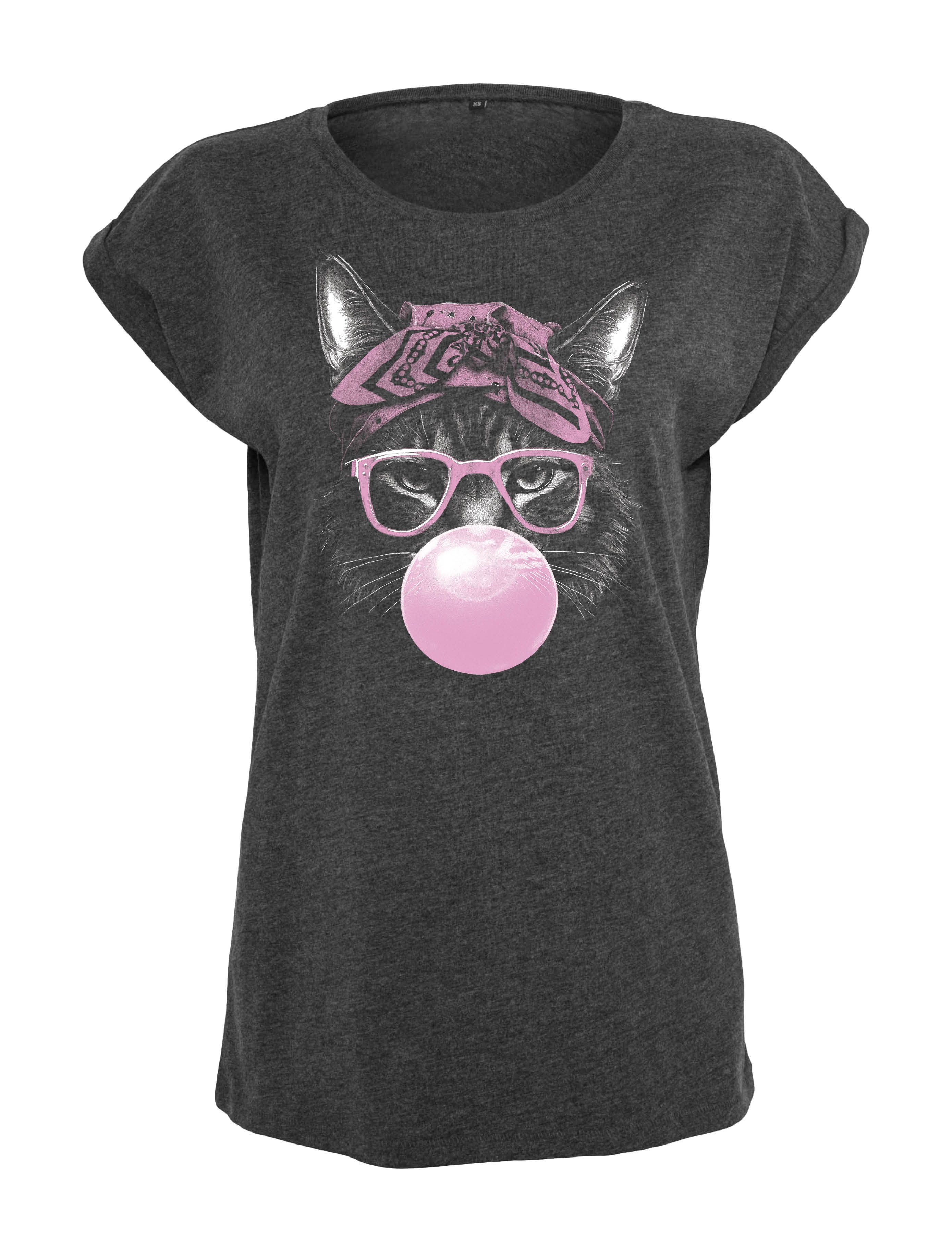 Charmantes Retro-Motiv: Mit stylischer Katze samt Brille, Kaugummi und Kopftuch mit Schleife – für einen witzigen und modischen Auftritt.