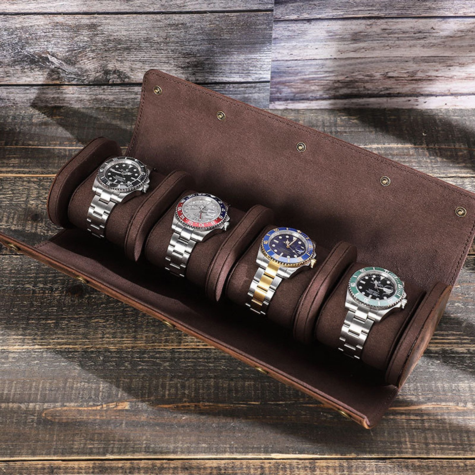 Hergestellt aus Crazy Horse Leder, ist diese 4 Uhren Rollbox perfekt für Reisen. Sie verfügt über abnehmbare Kissen und sichere Druckknopfverschlüsse, um Ihre Uhren zu schützen.