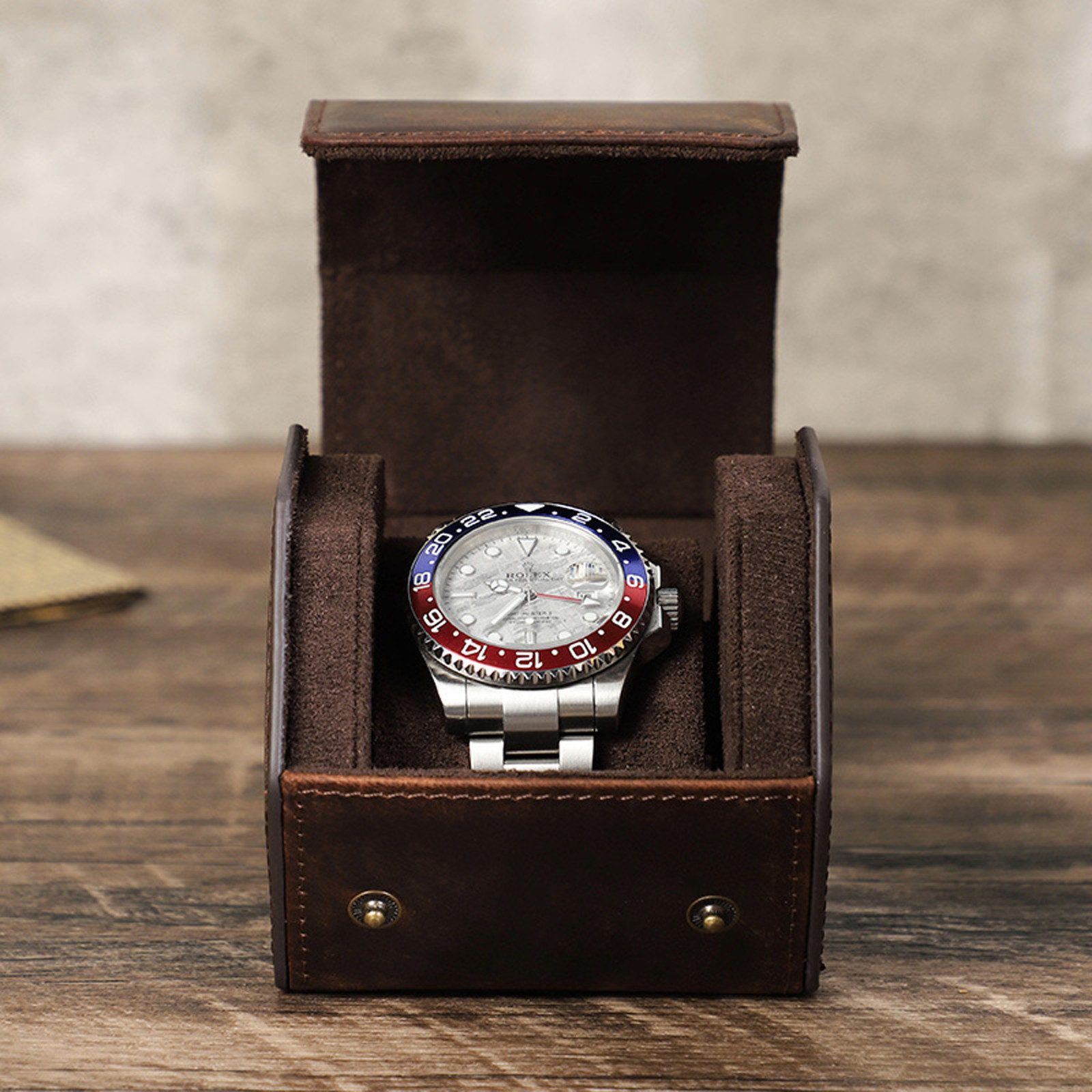 Handgefertigtes Uhrenetui aus Crazy Horse Leder mit einzigartigem hexagonalem Design. Ideal für Reisen und den Außenbereich. Hergestellt aus weichem und belüftetem Rindsleder. Bietet feste Gleitkissen für einfache Uhrenaufbewahrung. Kompakte Größe: 90mm x 95mm x 85mm.