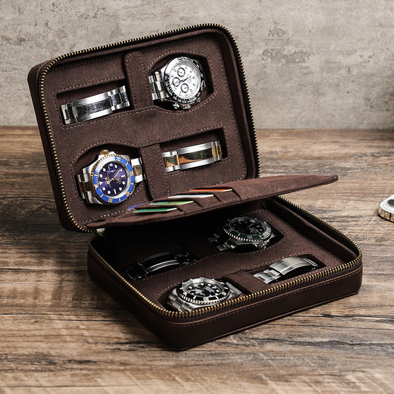Bewahren Sie bis zu 4 Uhren in diesem handgefertigten Etui aus Crazy Horse Leder auf. Mit Kartenfächern und Reißverschluss, ideal für Reisen.