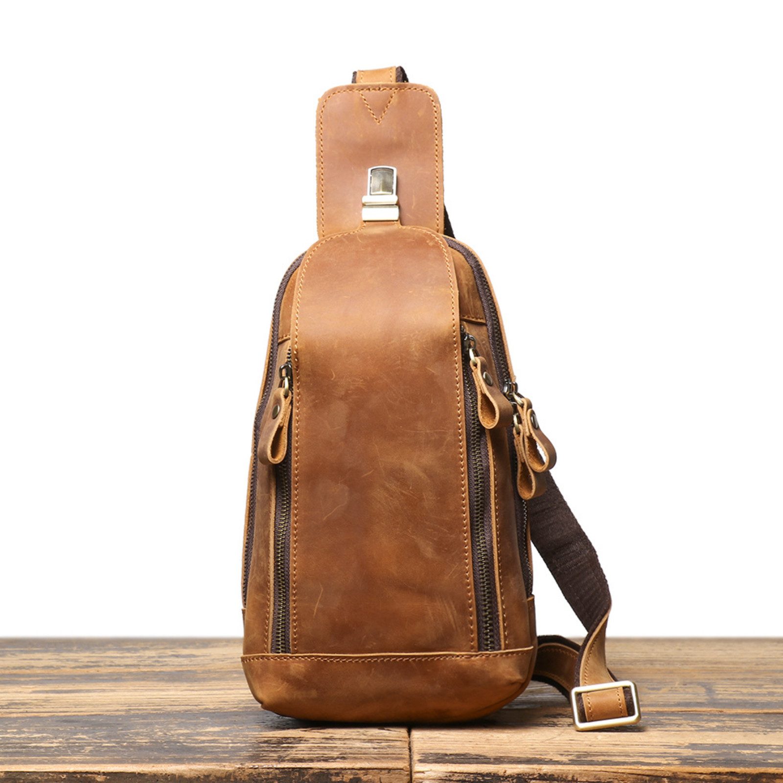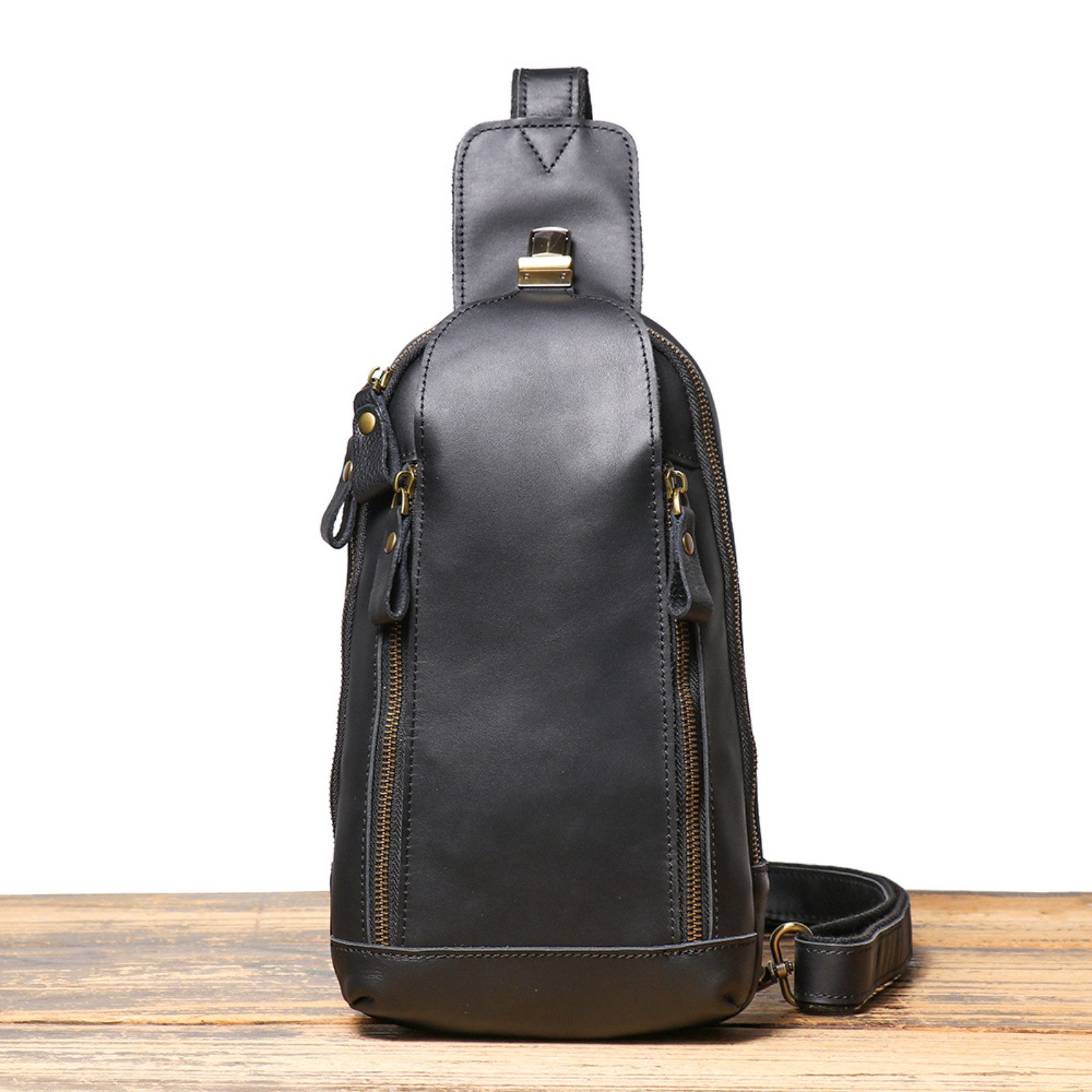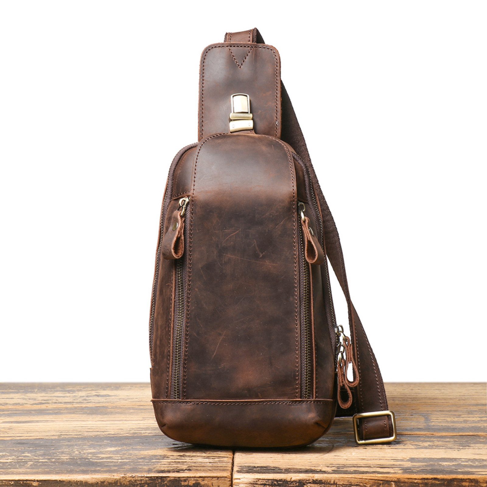 Herren Vintage Leder Umhängetasche mit robustem Design und verstellbarem Riemen. Diese kompakte Brusttasche aus echtem Leder bietet mehrere Reißverschlusstaschen zur organisierten Aufbewahrung und ist ideal für Alltag, Pendeln und Freizeit.