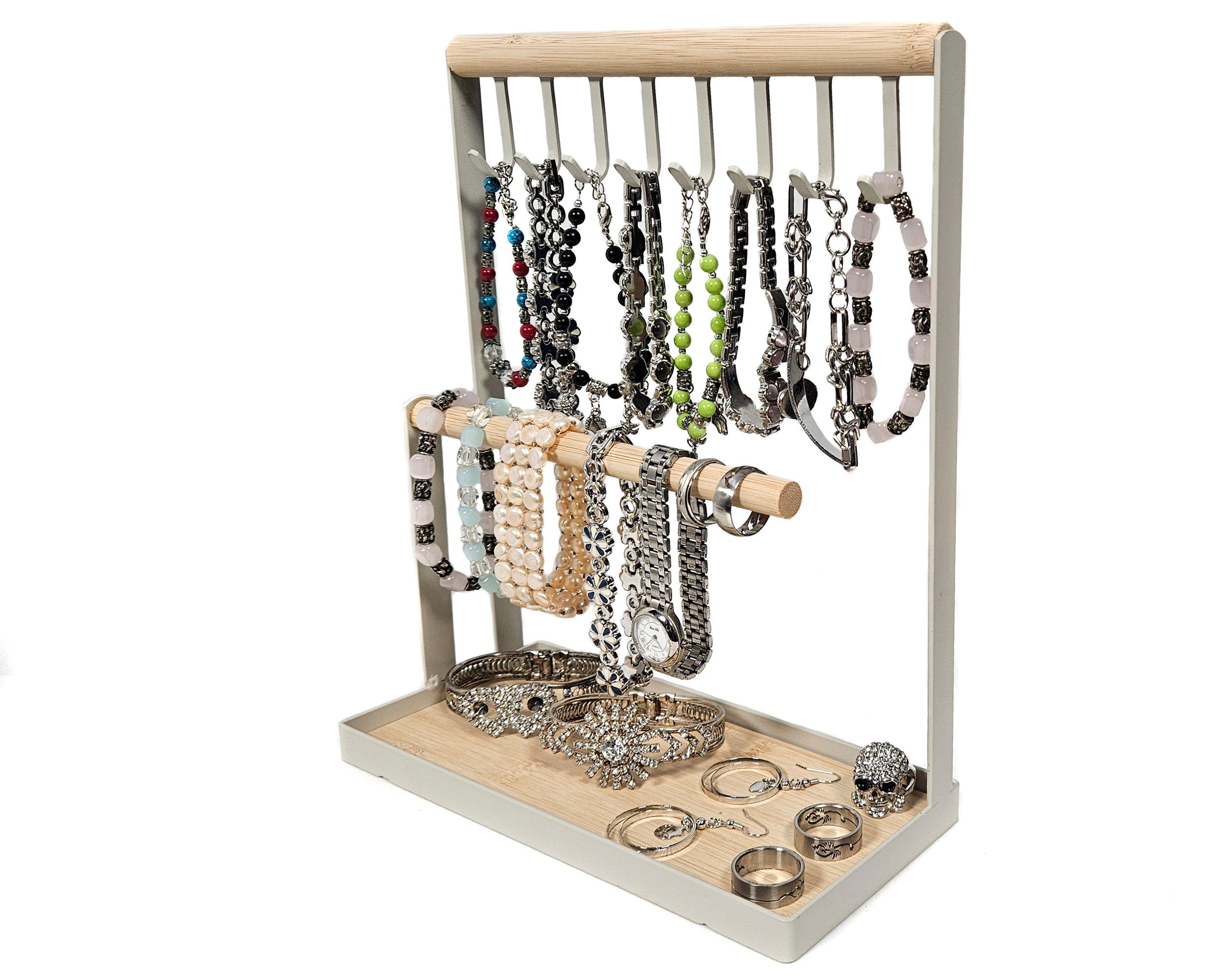 - Der vordere Stab ist aus Bambus, sodass Sie Ihren Schmuck problemlos auf die Halterungen schieben oder herunternehmen können, eignet sich zur Aufbewahrung all Ihrer Lieblingsstücke, z. B. Ringe, Ketten, Armbänder, Uhren, Fußketten, Reifen an Stange