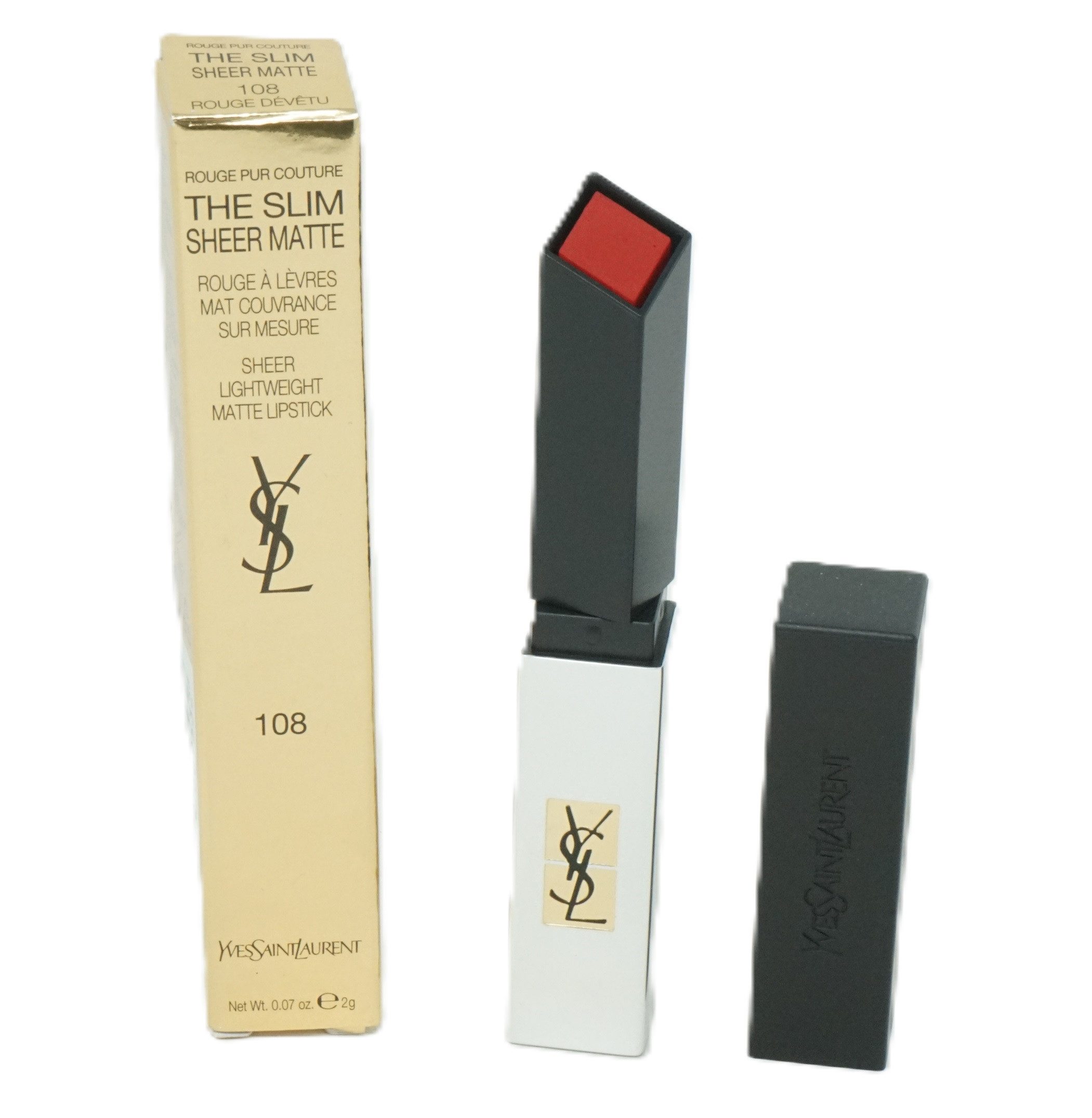 Der Yves Saint Laurent Rouge Pur Couture The Slim Sheer Matte im Farbton 108 Rouge Devetu kombiniert die Leichtigkeit eines Sheer-Lippenstifts mit einem matten, samtigen Finish Die innovative Formel sorgt für ein federleichtes Tragegefühl und eine dezente, aber intensive Farbgebung 108 Rouge Devetu ist ein intensives, lebendiges Rot, das den Lippen einen mutigen, ausdrucksstarken Look verleiht, während es ein samtiges, mattes Finish bewahrt
