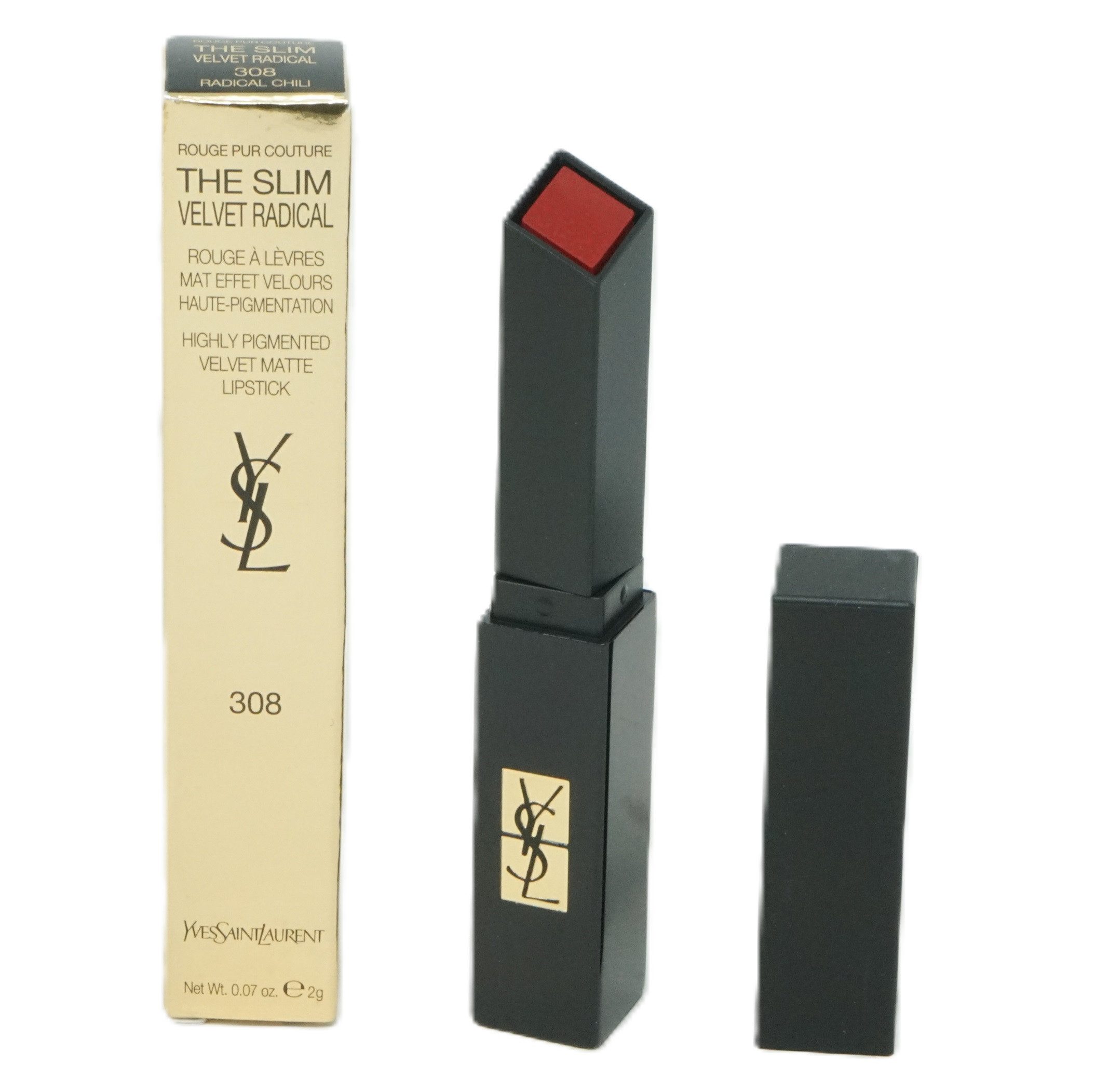 Yves Saint Laurent Rouge The Slim Velvet Matte 308 Radical Chili ist ein hochpigmentierter, luxuriöser Lippenstift mit einem intensiven, samtig-matten Finish Die leichte, cremige Formel gleitet sanft über die Lippen und sorgt für eine langanhaltende, volle Farbe, ohne die Lippen auszutrocknen Farbton 308 Radical Chili ist ein kräftiges, warmes Chili-Rot, das für einen mutigen, ausdrucksstarken Look sorgt