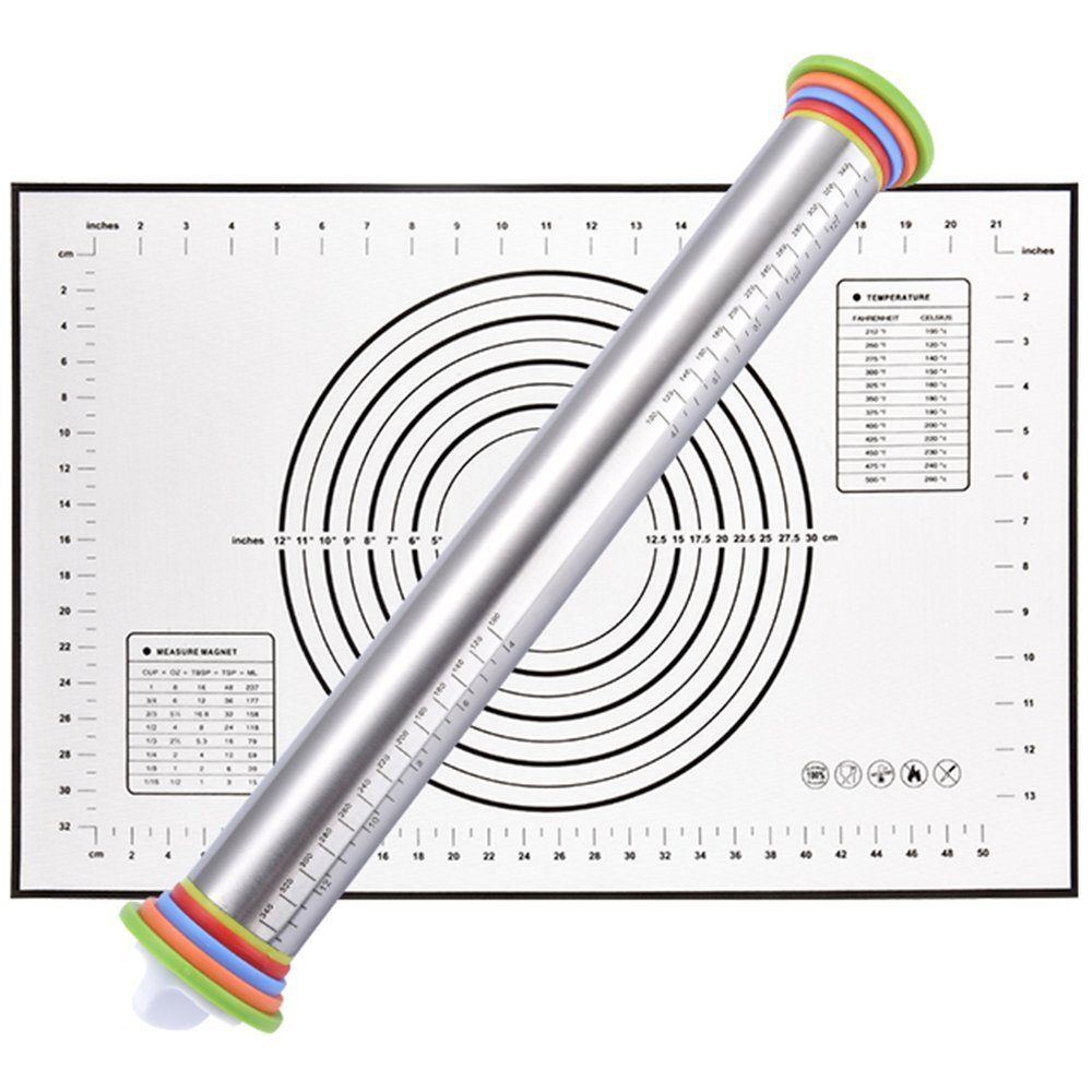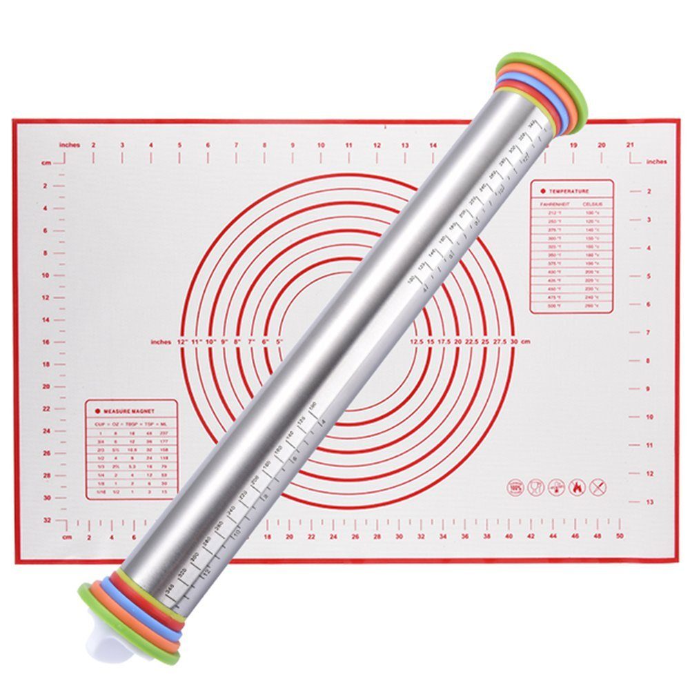 Lieferumfang | 43 cm Nudelholz aus rostfreiem Stahl (Dicke verstellbar) und 40 x 60 cm Silikonbackmatte |