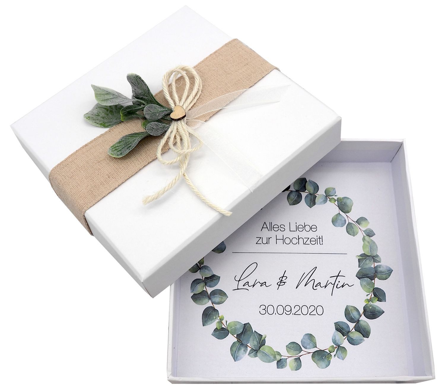Die Geldgeschenk Verpackung wird mit den Namen des Paares, sowie dem Datum der Trauung bedruckt.