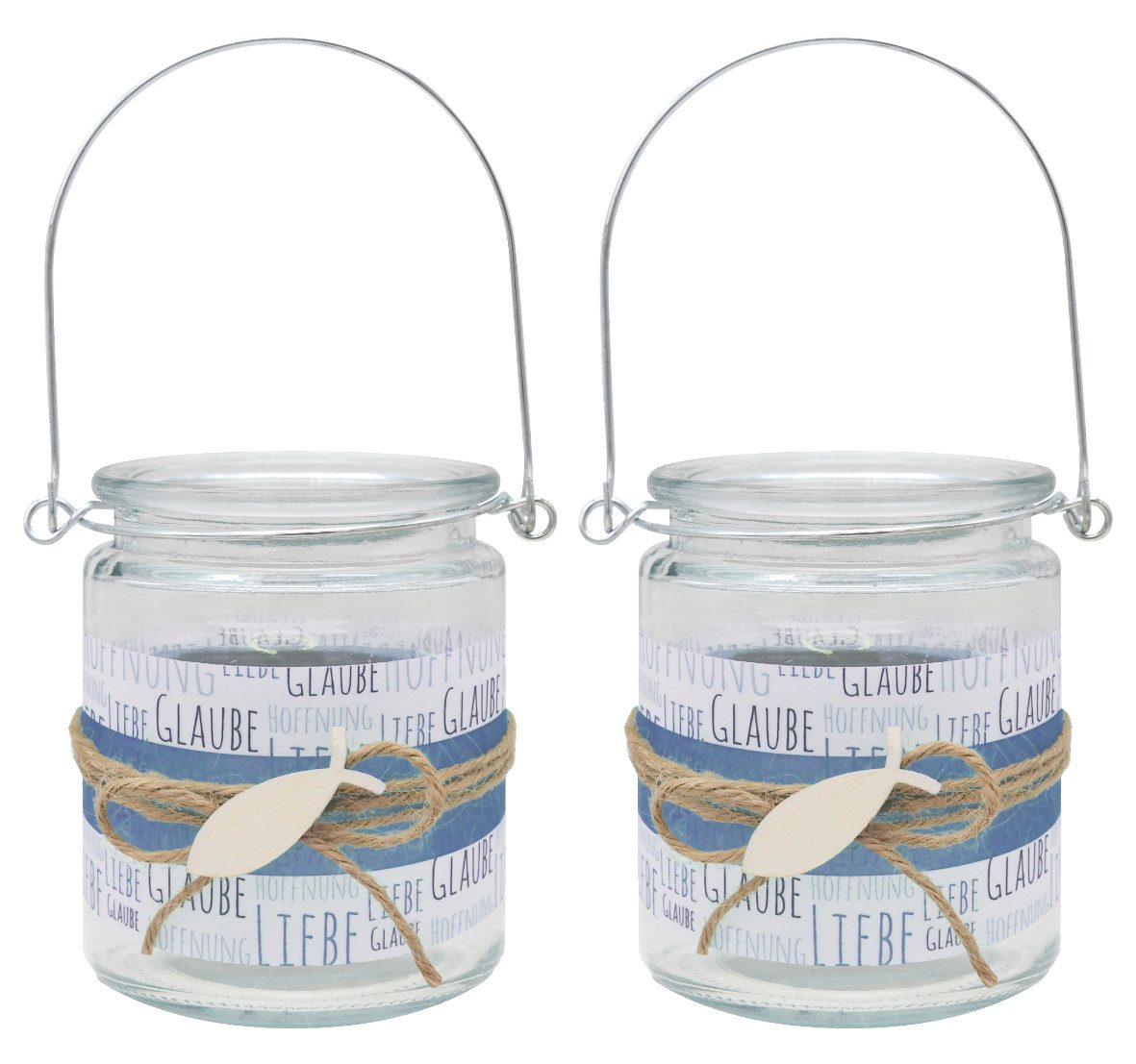 Zwei Windlichter mit Banderole in Blau, Beschriftet mit "Glaube, Liebe und Hoffnung". Umwickelt mit einer Naturkordel und mit einem weißen Holzfisch dekoriert.