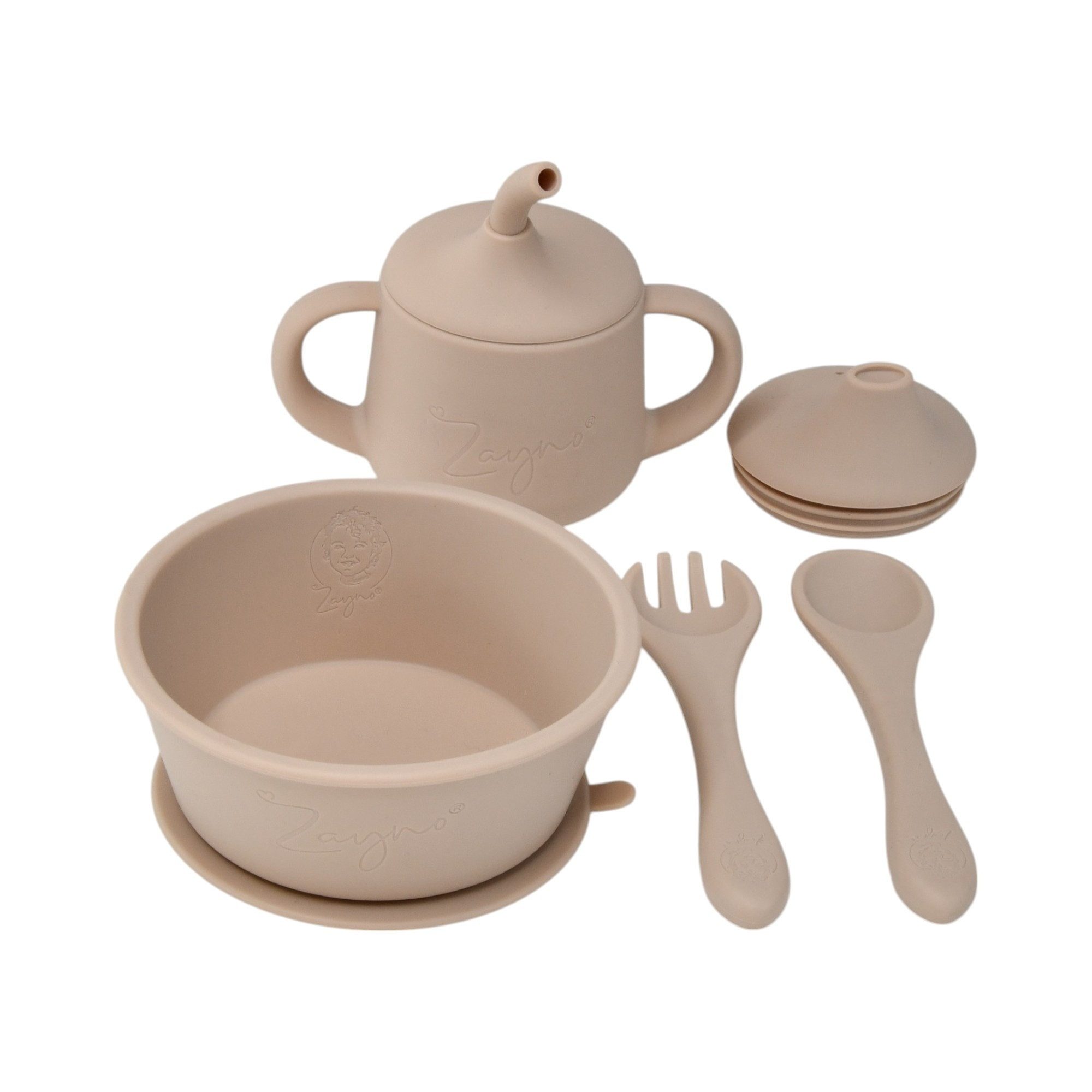 Unser Zayno® Ess-Set für Babys besteht aus hochwertigem, lebensmittelechten Silikon. Besonders praktisch ist das Schälchen, da es an der Unterseite über einen Saugfuß verfügt, der eine sichere Befestigung ermöglicht. Dadurch wird verhindert, dass die Schale während der Mahlzeiten umkippt oder verrutscht - besonders wichtig, wenn dein Baby gerade das eigenständige Essen übt. Der Trinkbecher hat zwei seitliche Griffe, die deinem Baby das Festhalten erleichtern.