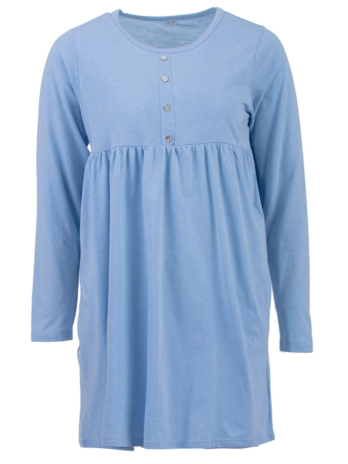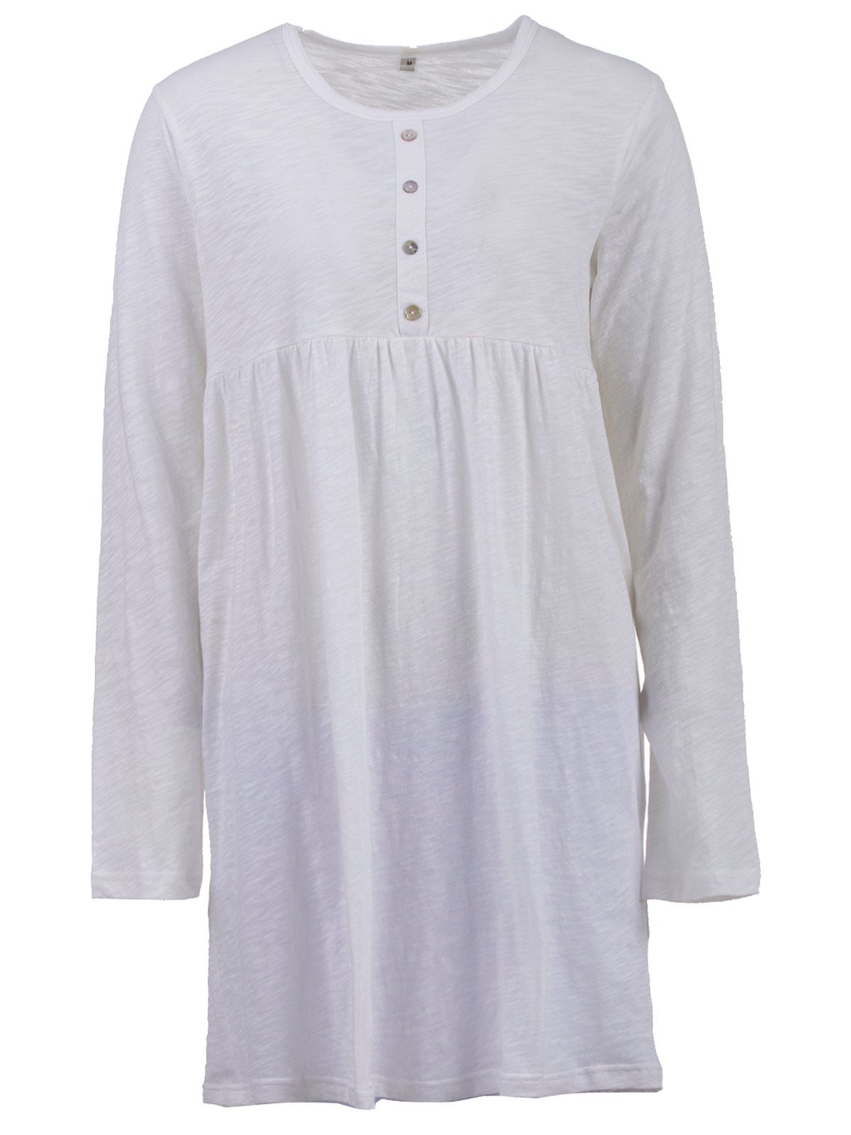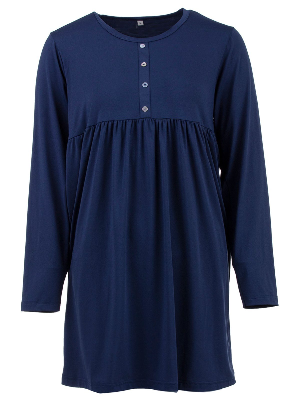 Das zart fließende Single-Jersey Nachthemd mit langem Arm und in weicher Qualität besticht durch eine elegante Schnittführung und Raffinesse im Detail. Durch die hübsche Raffung unter der Brust bekommt das Nachthemd einen besonders femininen und romantischen Touch. Rundhalsausschnit mit Knopfleiste.